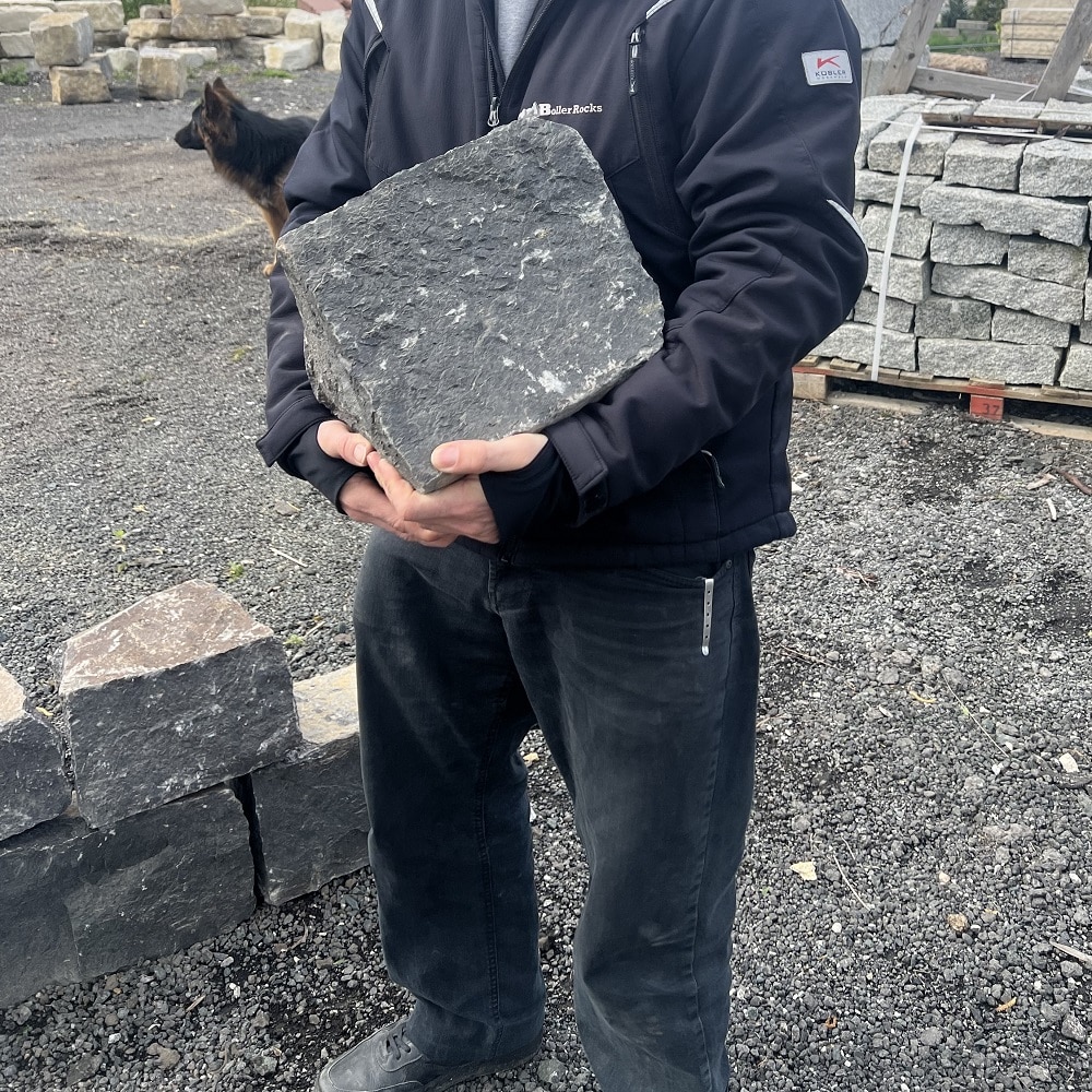 Dieser kleine Basalt Quaderstein eignet sich bestens als Gartenmauer und Trockenmauerstein.