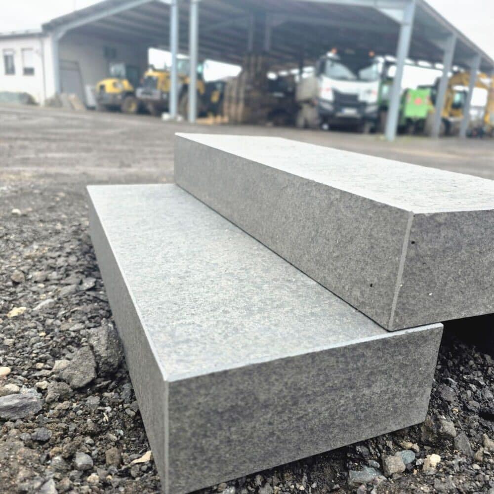 Alternativ bieten wir die Blockstufen auch aus regionalem Basalt an, diese Variante besitzt einen leicht abweichenden Anthrazitton und ist nachhaltiger durch kürzere Transportwege.