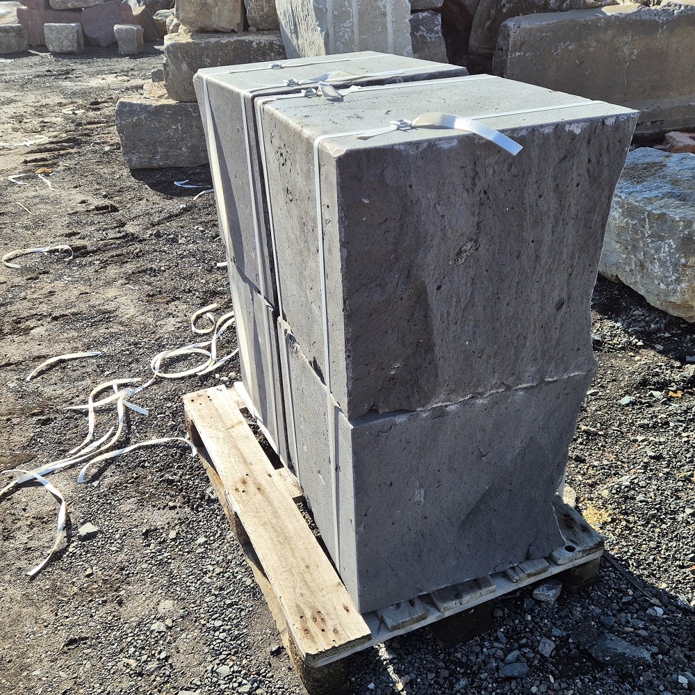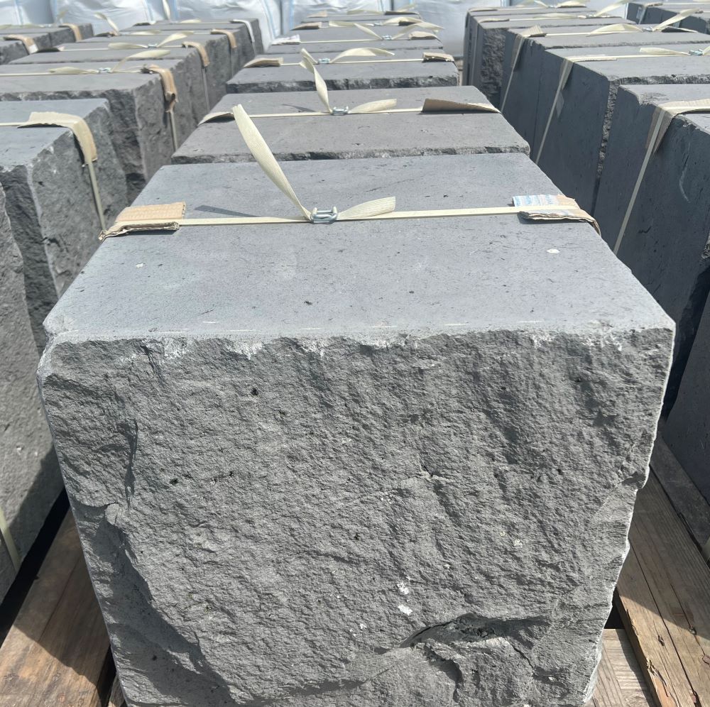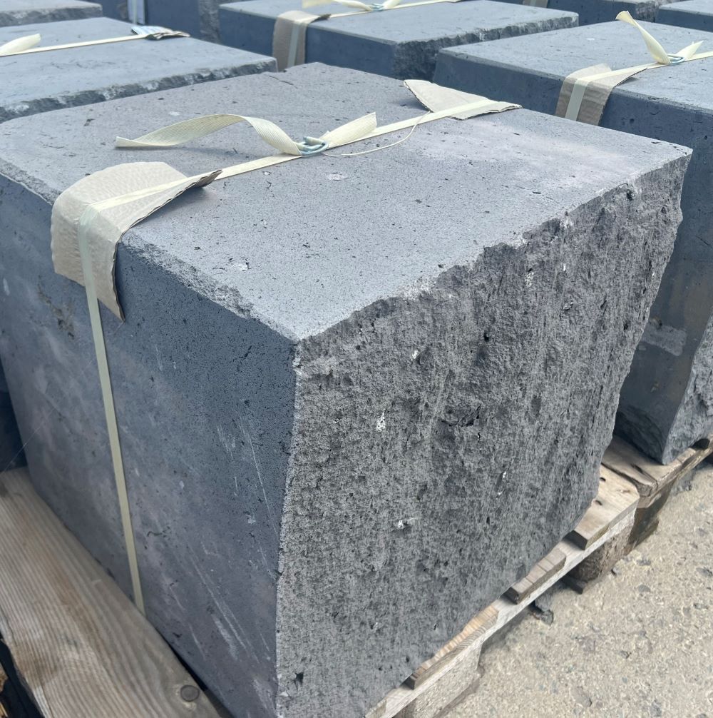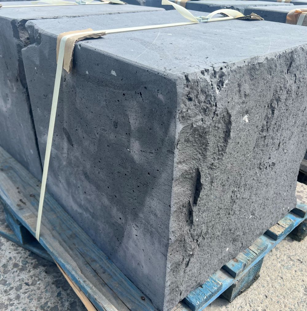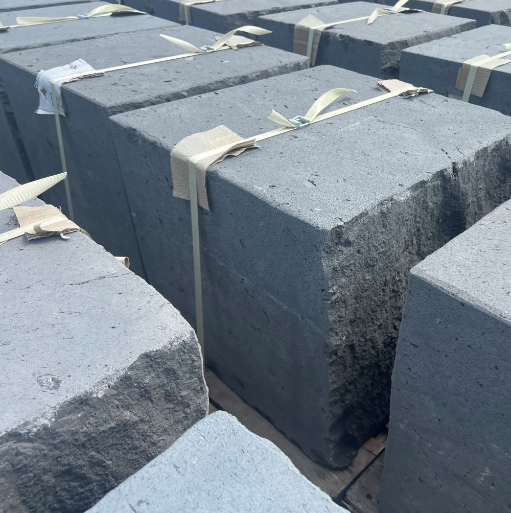 Diese Naturstein Würfel werden auf Paletten geliefert.