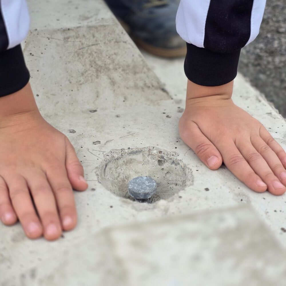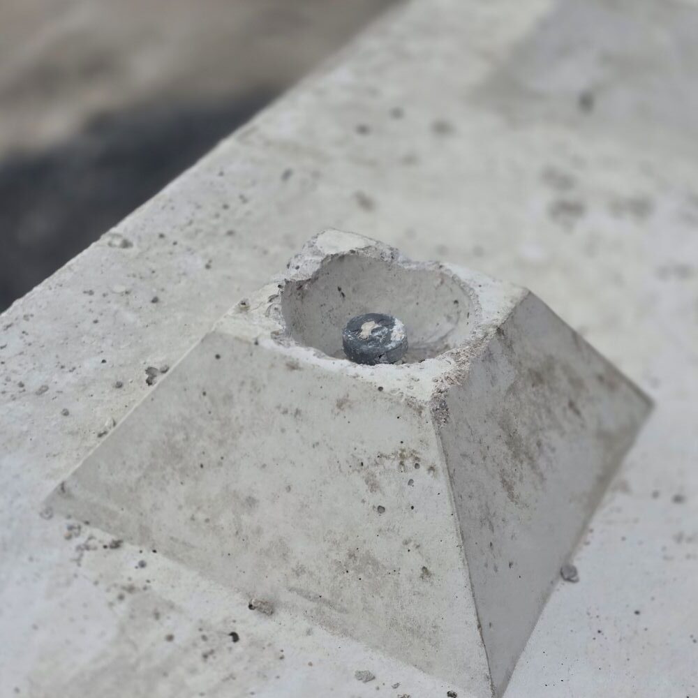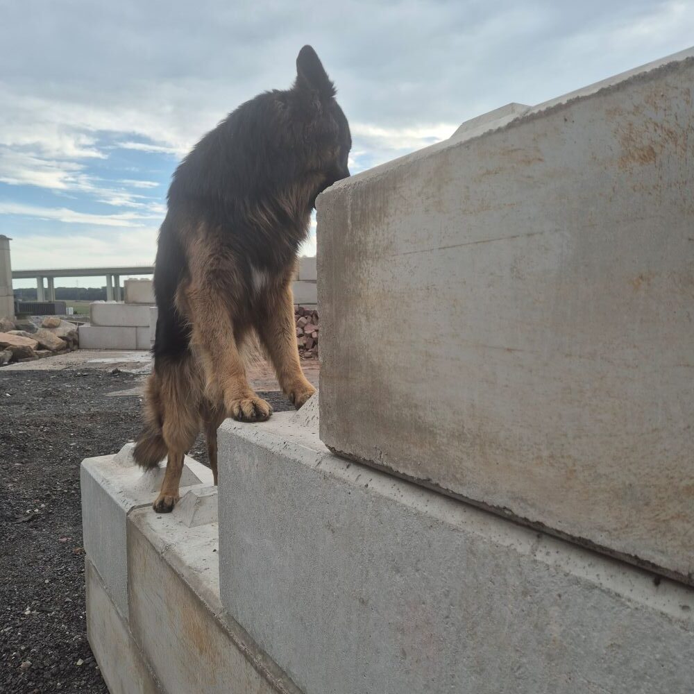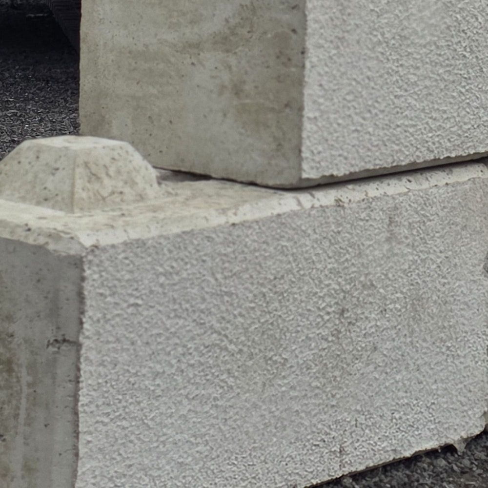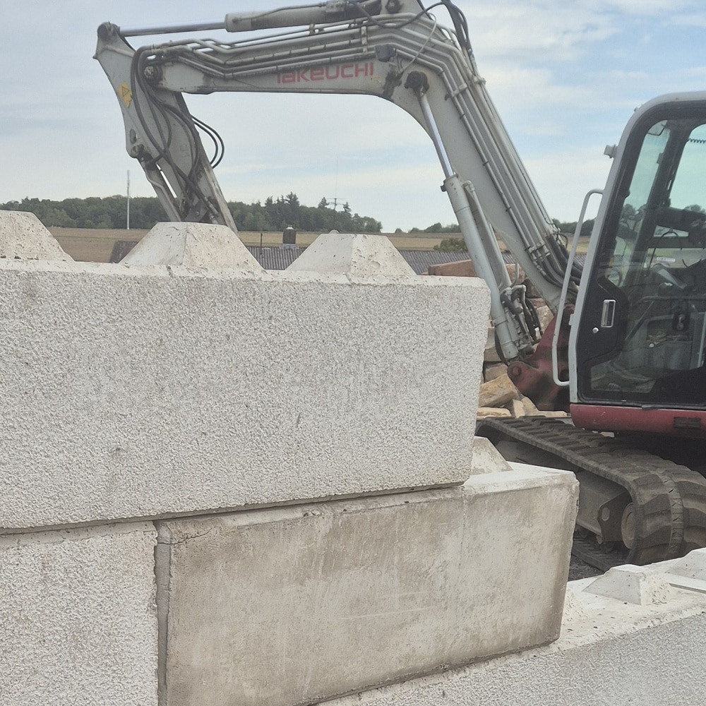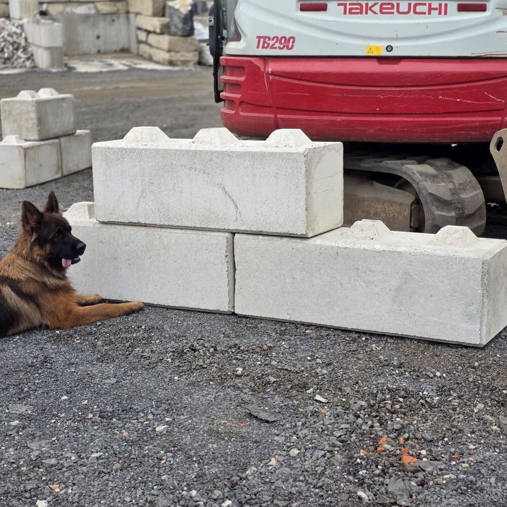 Dieser massive Betonstein mit rund einer halben Tonne Gewicht ist der zweitgrößte Stein aus der 40 cm x 40 cm Serie. Trotz seiner Größe lässt er sich mit Minibaggern ab ca. 3,5 Tonnen gut versetzen.