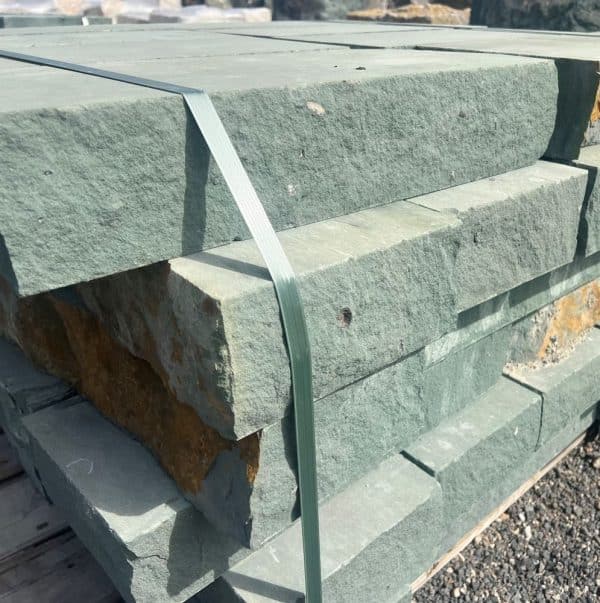 Diese grünen Trockenmauersteine werden auf Paletten geliefert.