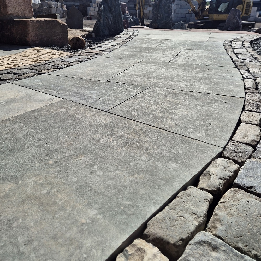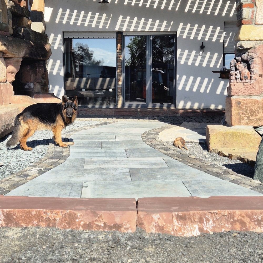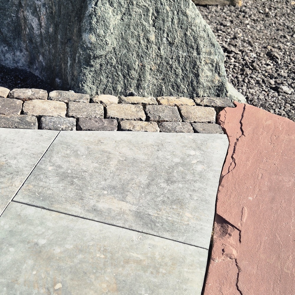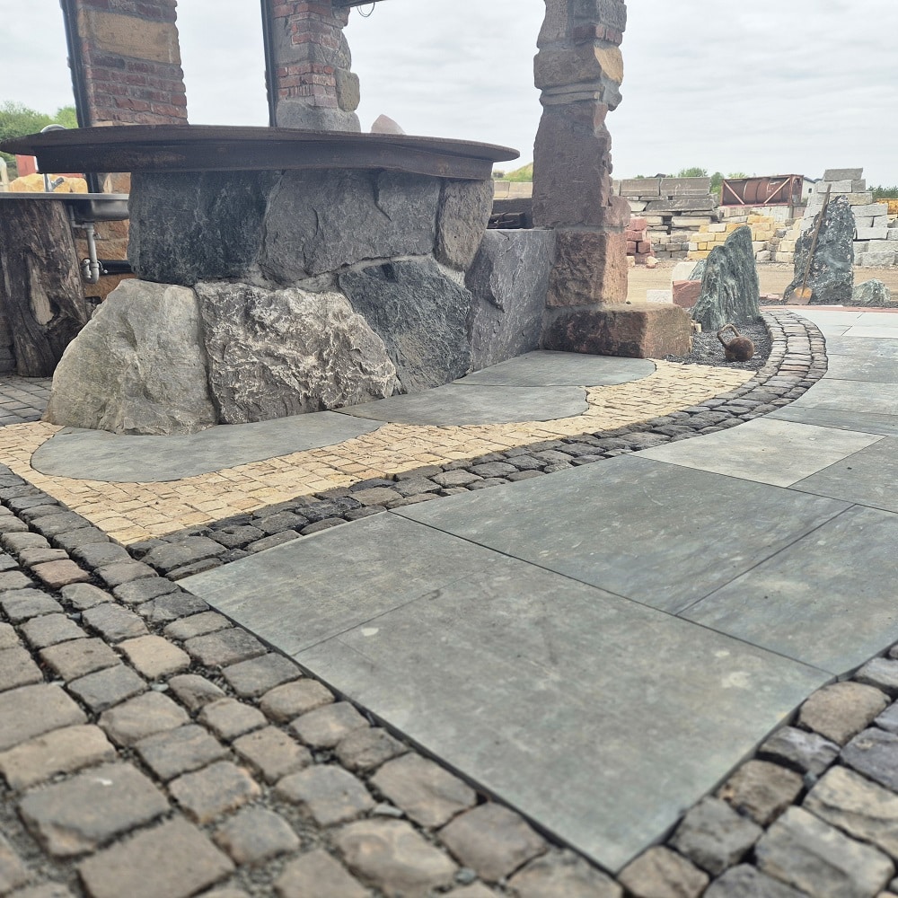 So fügt sich der grau- grünliche Bodenbelag spielerisch in jede Außenanlage ein und harmonisiert mit jeder Bepflanzung und auch anderen Steinvarianten.