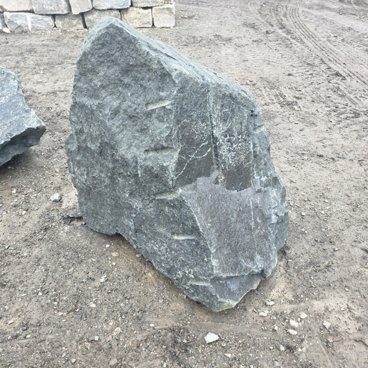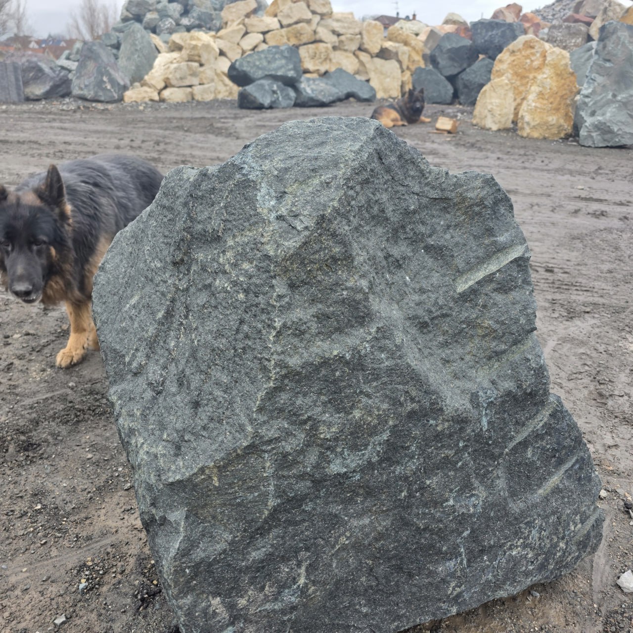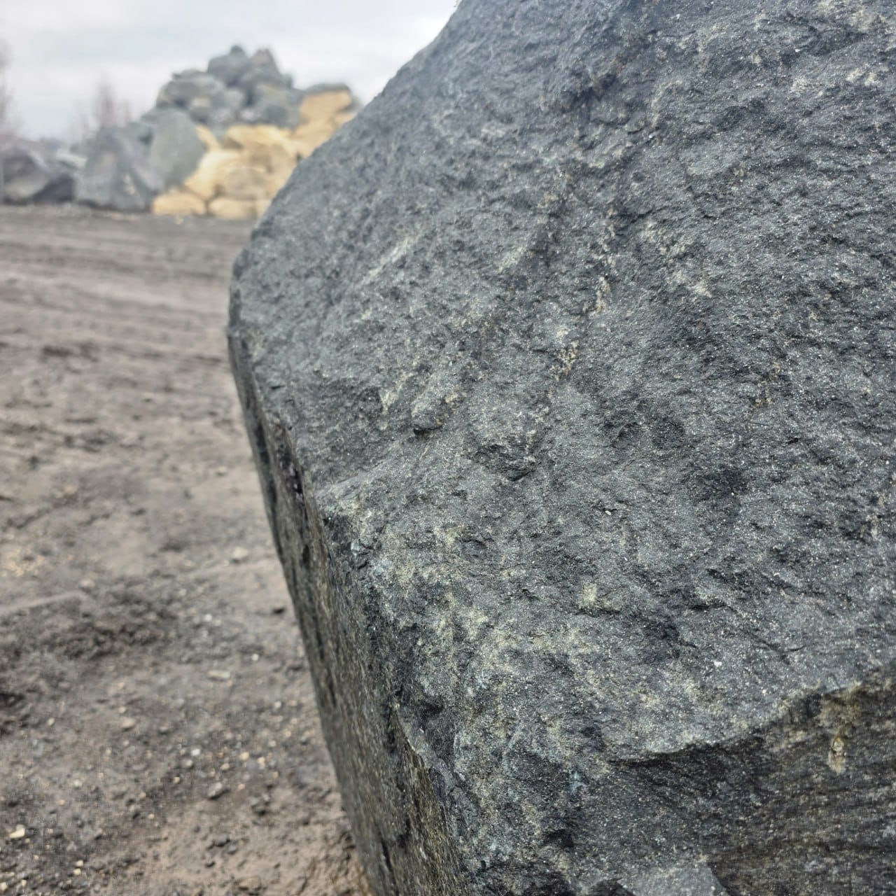 Beim Abkippen können allerdings Ecken abbrechen und die Steine ​​beschädigt werden. Dabei sollten Sie beachten, dass dieser tolle Findling bis er auf Ihrer Baustelle ankommt schon mindestens drei Mal mit Geräten wie Baggern oder großen Radladern aufgeladen und anschließend wieder abgekippt wurde.