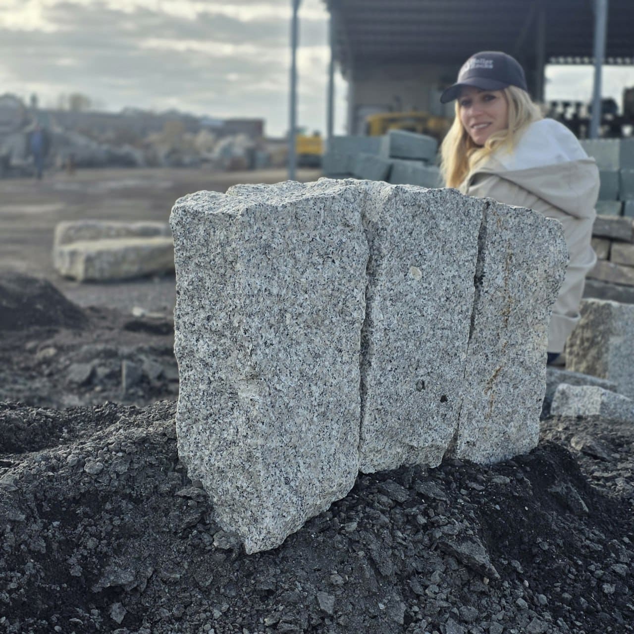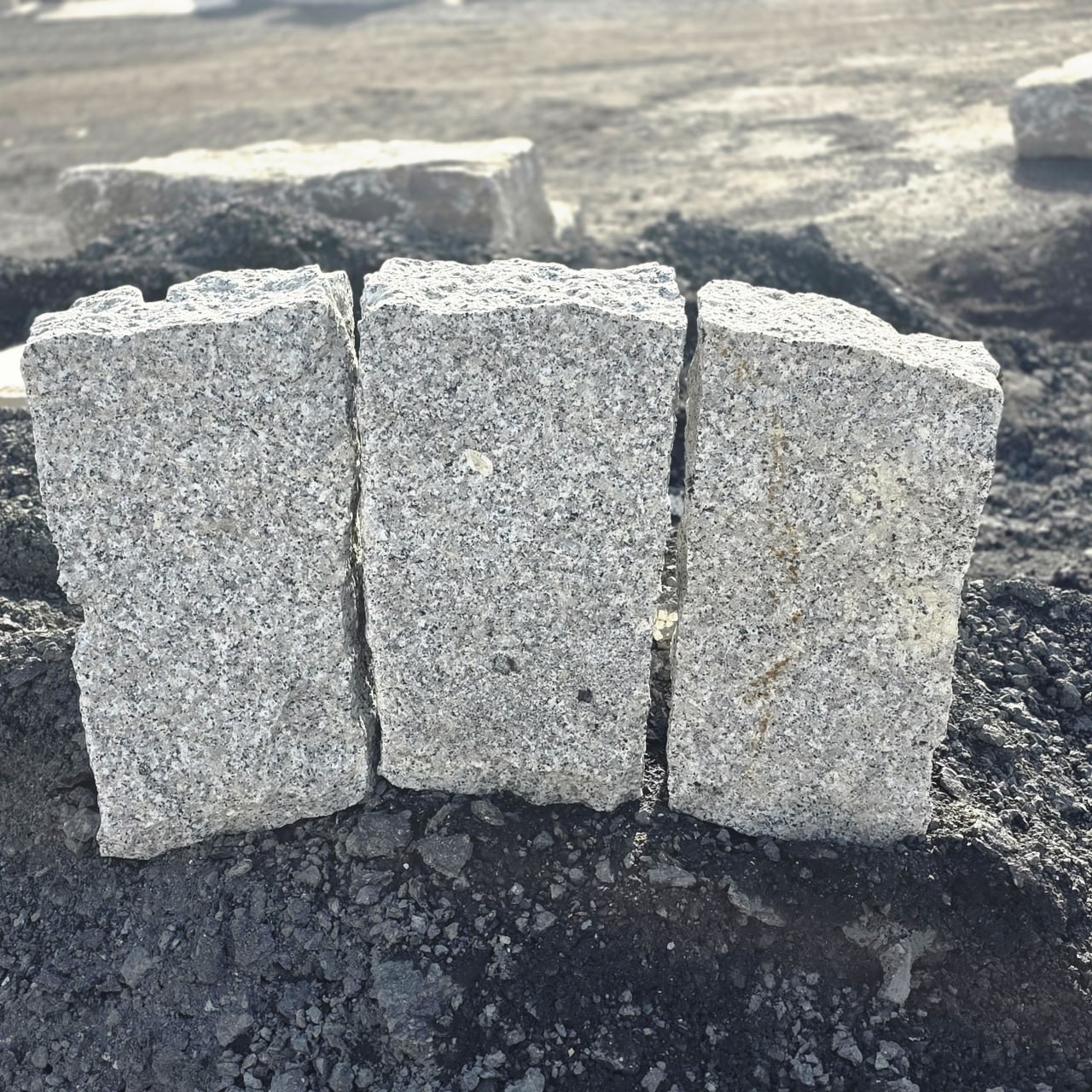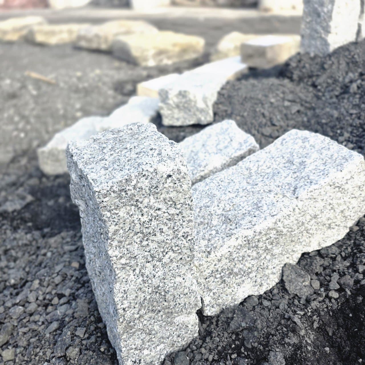 Dieser graue Granit Naturstein Mauerstein wird in der Regel gekippt oder als Paletten-Ware geliefert.