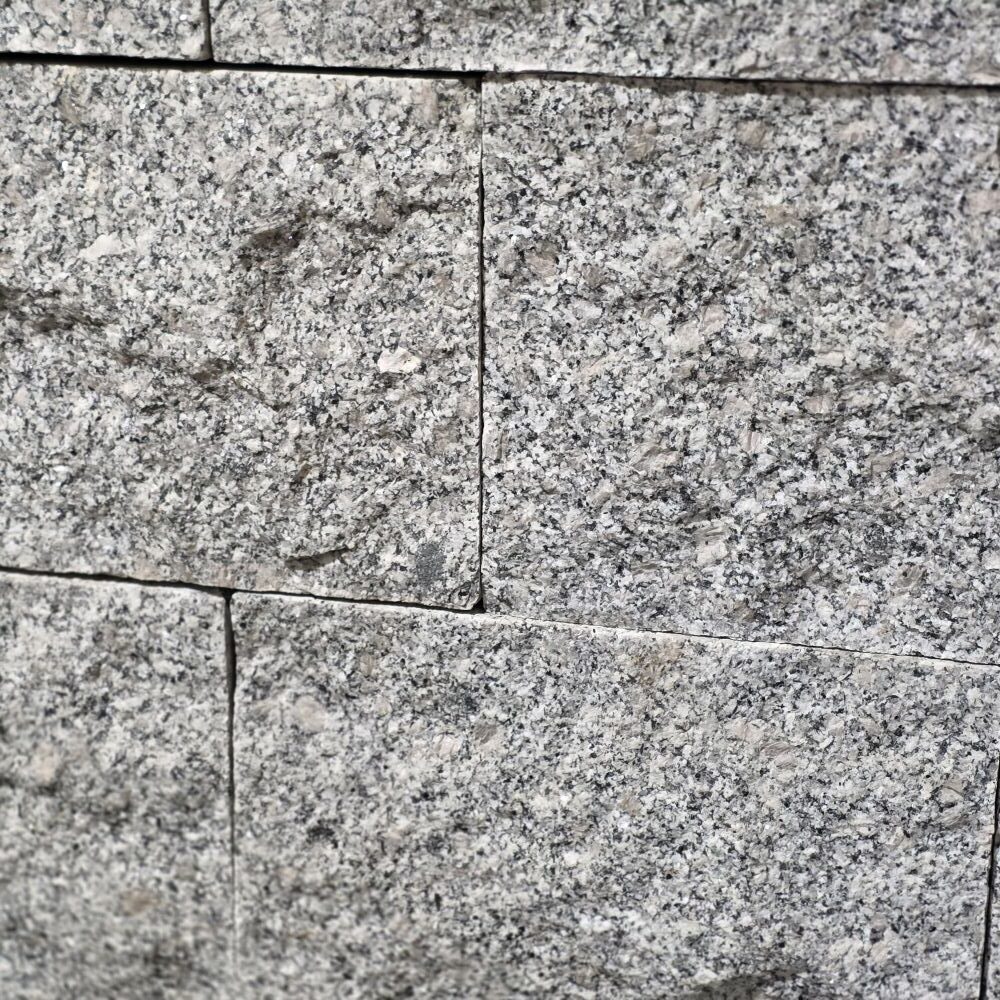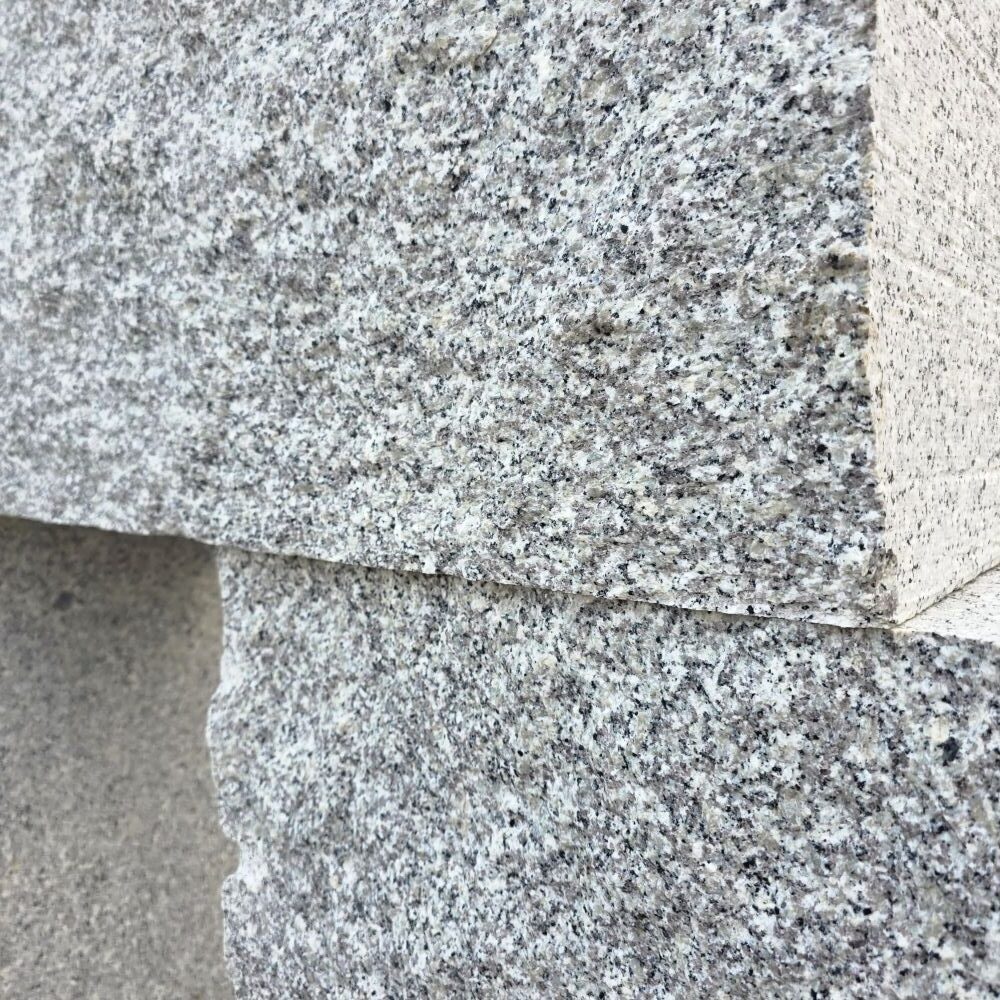Der klassisch gesägte Mauerstein aus grauem Granit überzeugt durch sein modernes Erscheinungsbild, seine Robustheit und seine gesägten Lagerfugen.