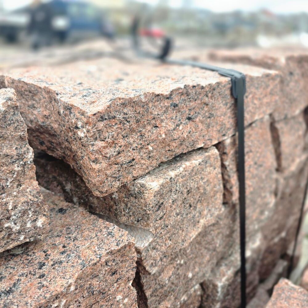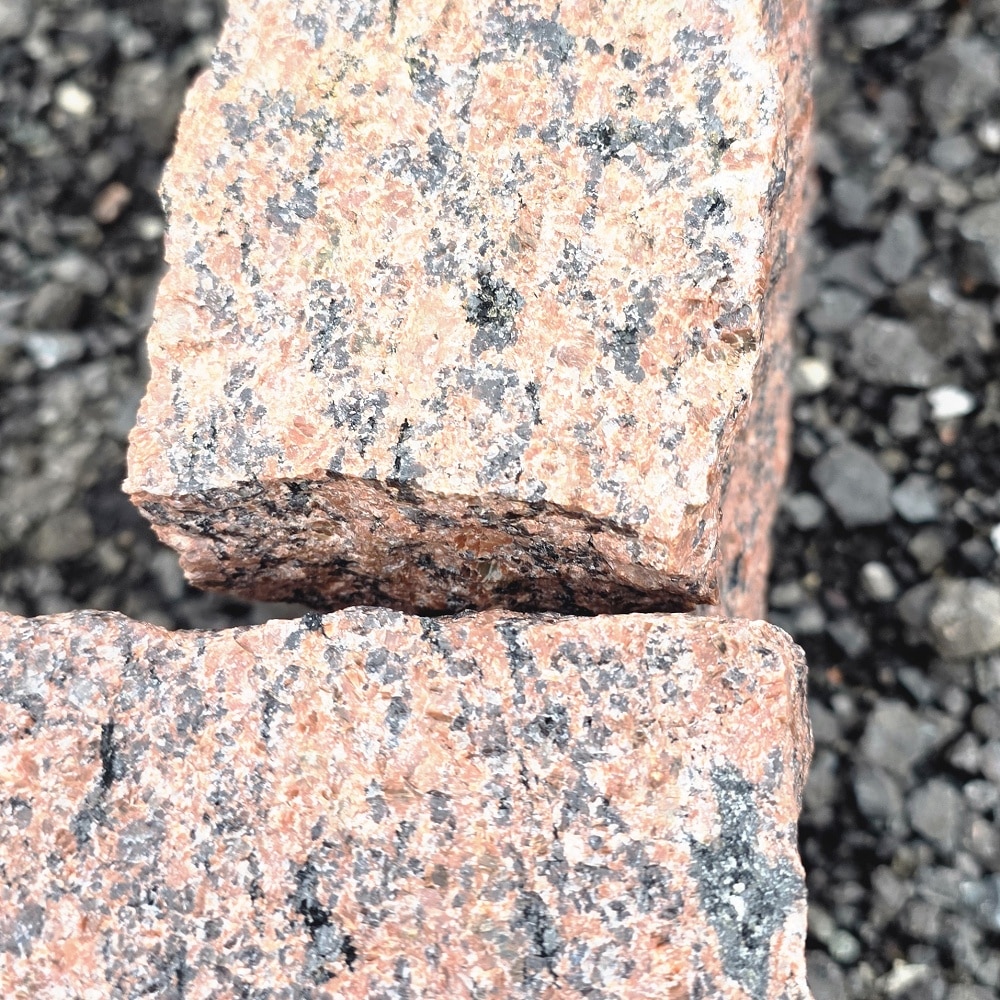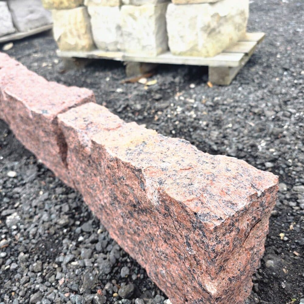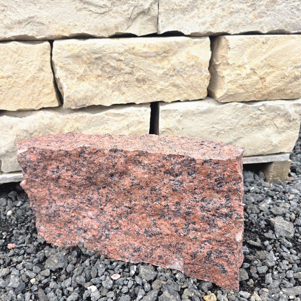 🧱 Neben der Verwendung als Randstein ist dieser Granit auch als gespaltener Mauerstein im Format 10 × 20 × 40 cm erhältlich und kann für Trockenmauern oder gemörtelte Natursteinmauern eingesetzt werden. Ideal, wenn Rand- und Mauerbereiche optisch aufeinander abgestimmt werden sollen.