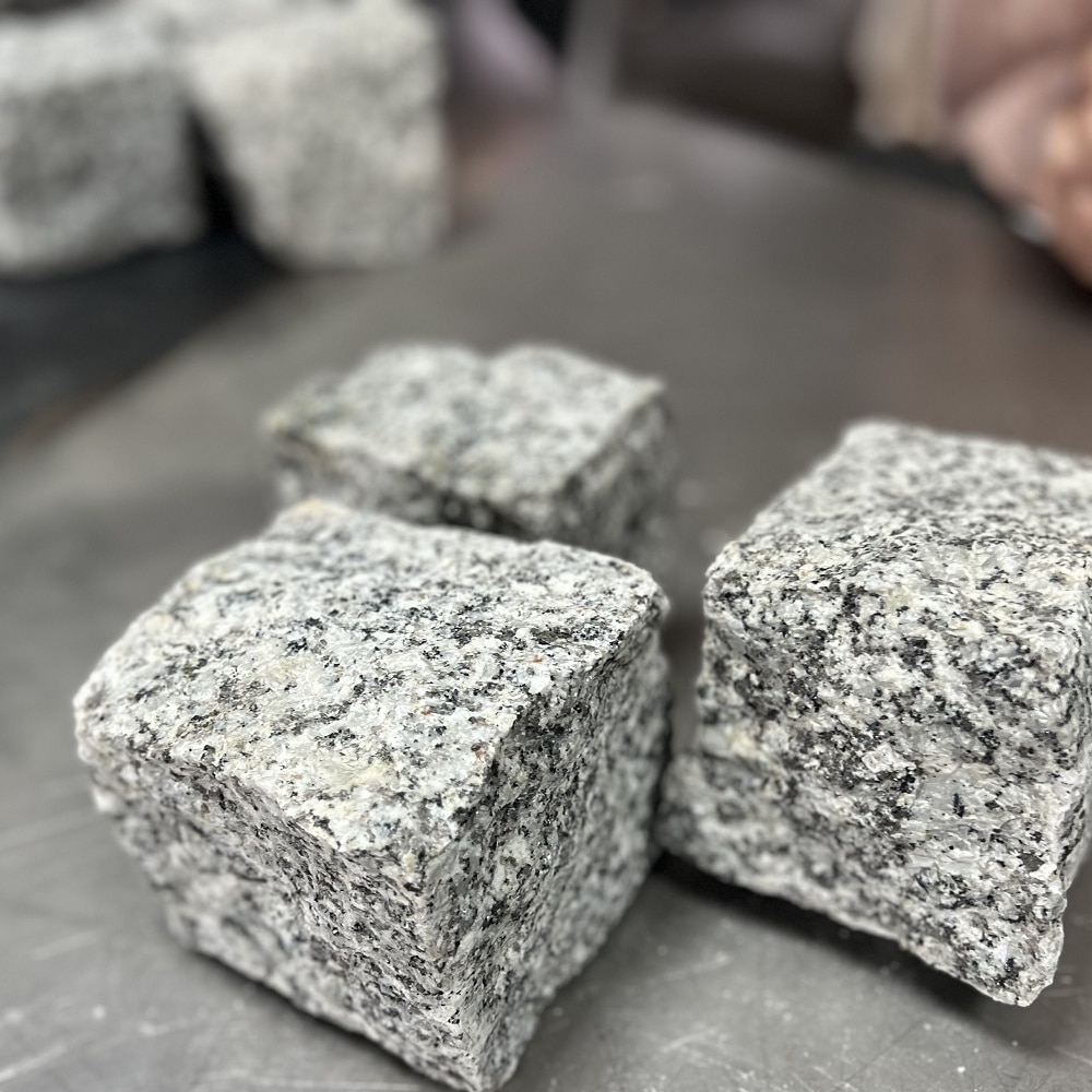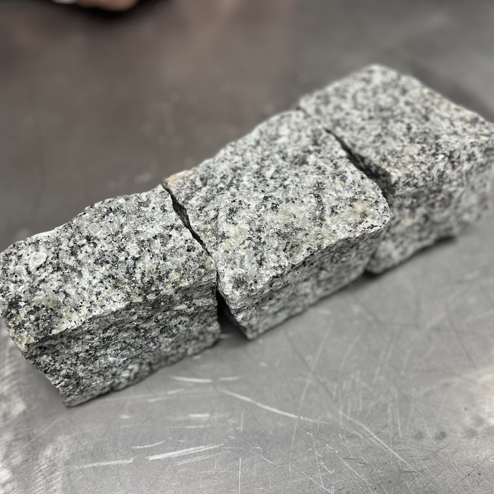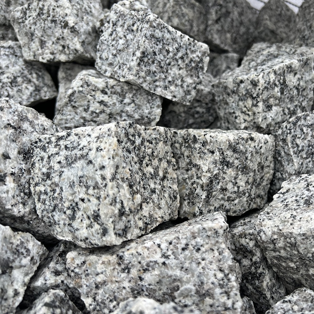 Rundum hand- gespaltener grauer Granit Kopfsteinpflaster Würfel im Standardformat.