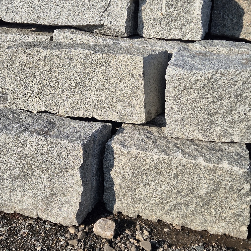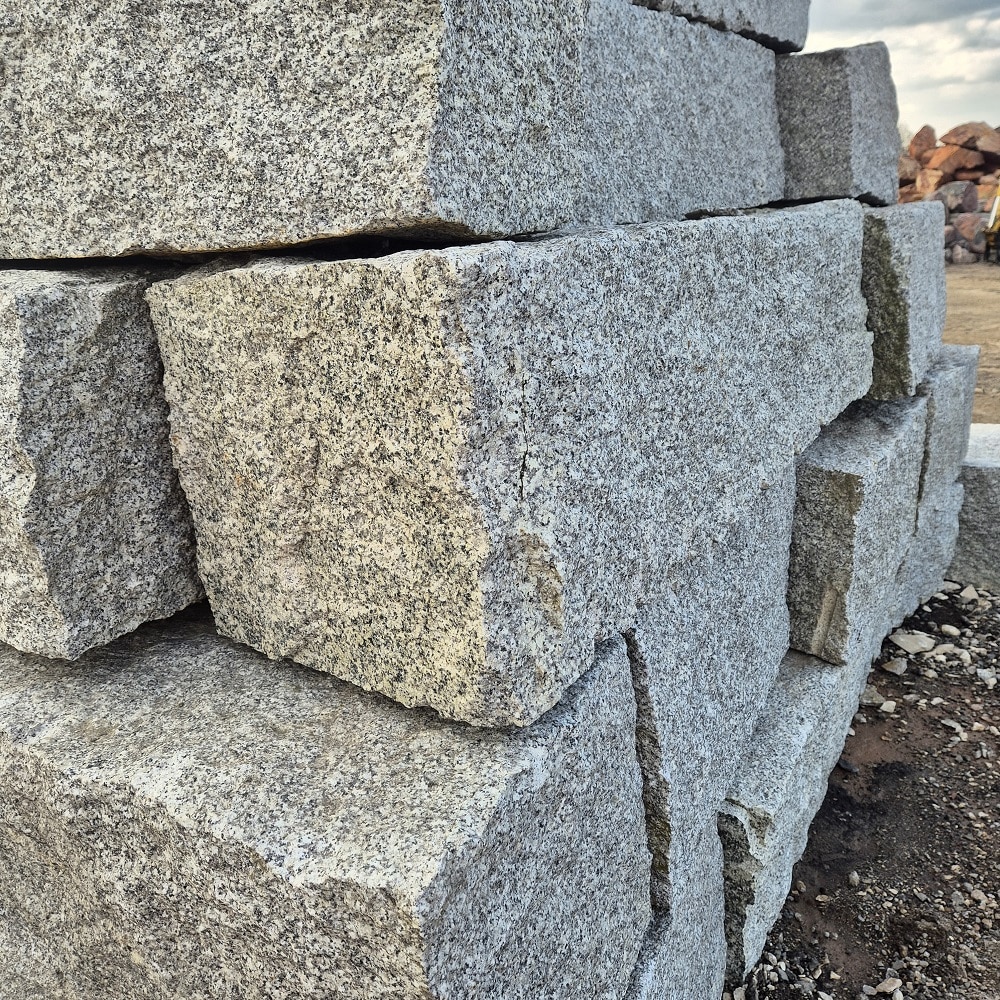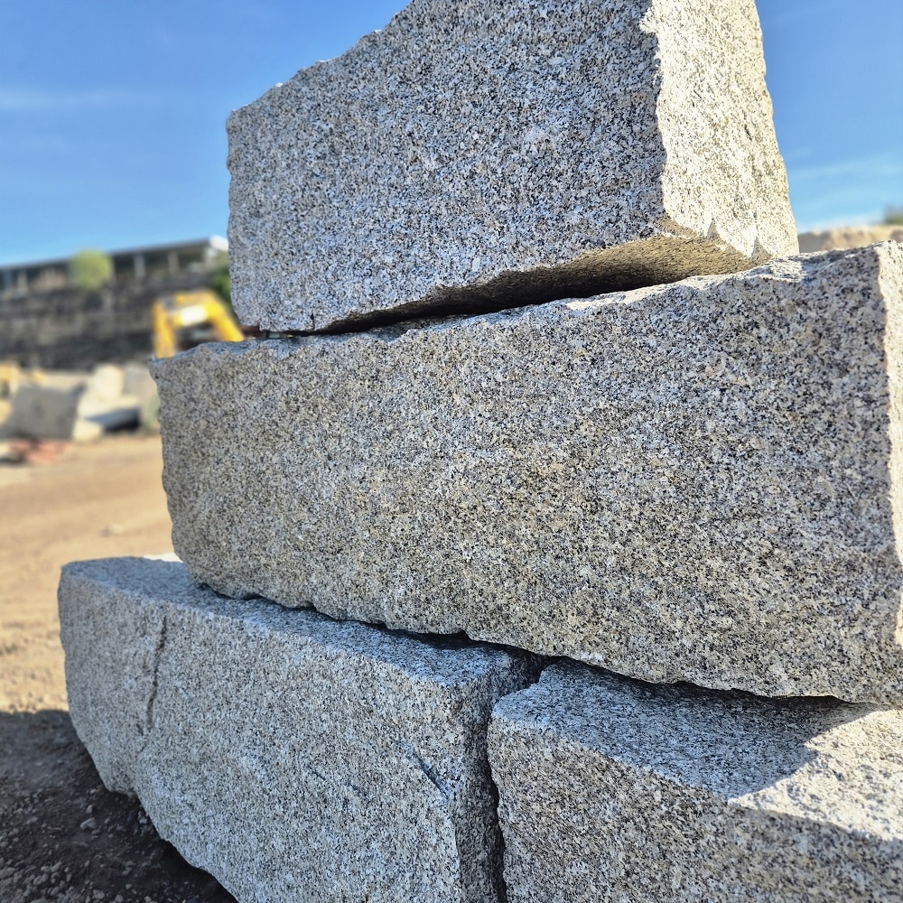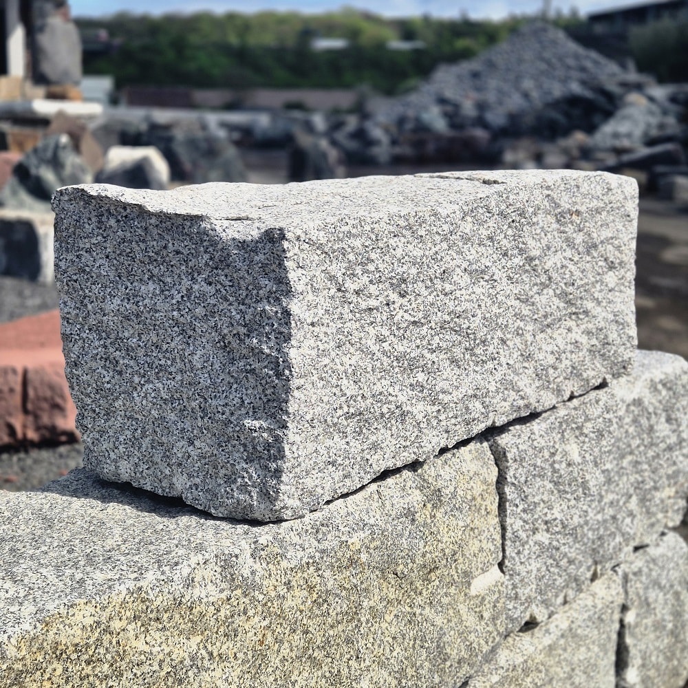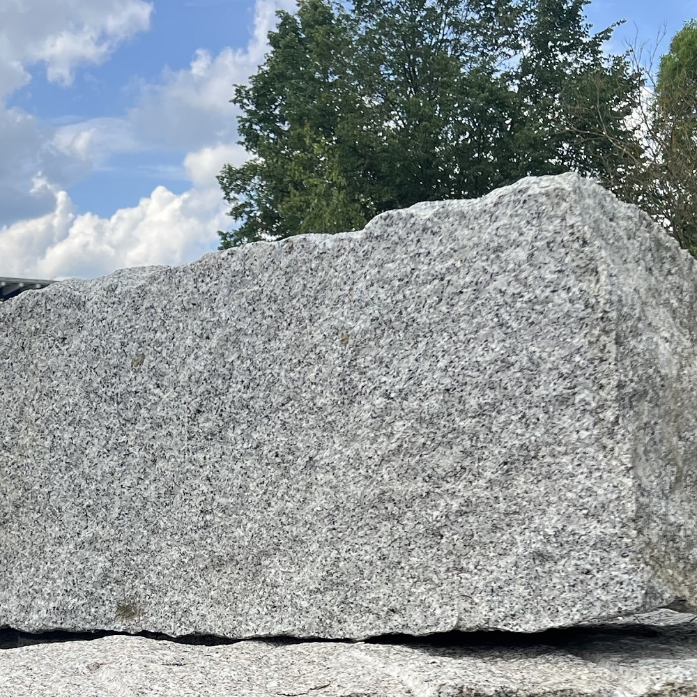 Das Farbspektrum dieses Granit Mauersteins reicht von weiß, über grau bis schwarz und sieht im Gesamtverband gräulich aus.