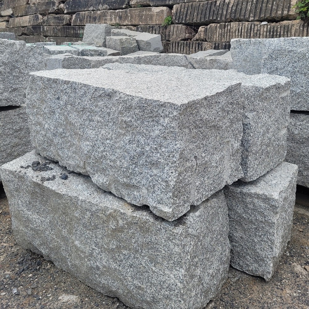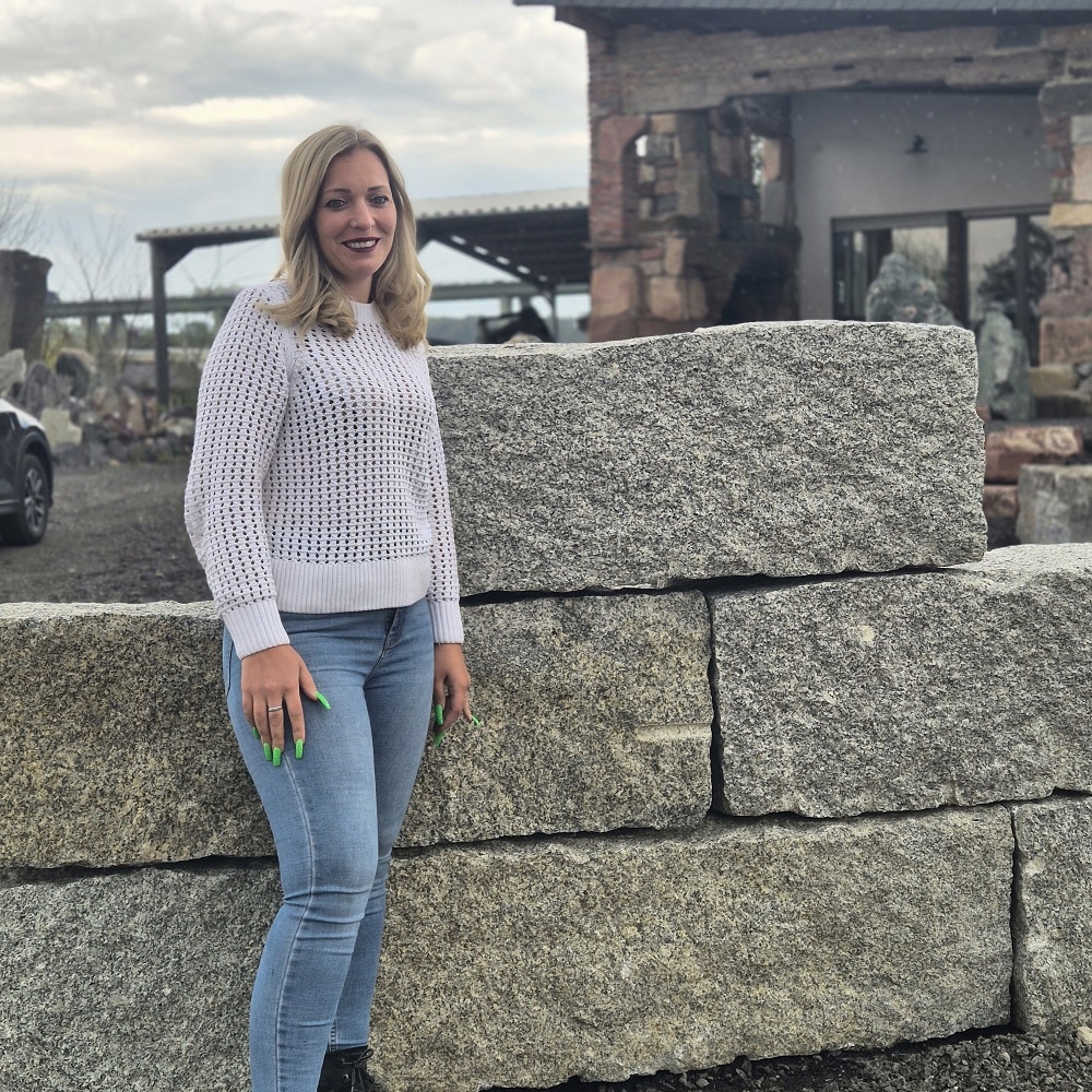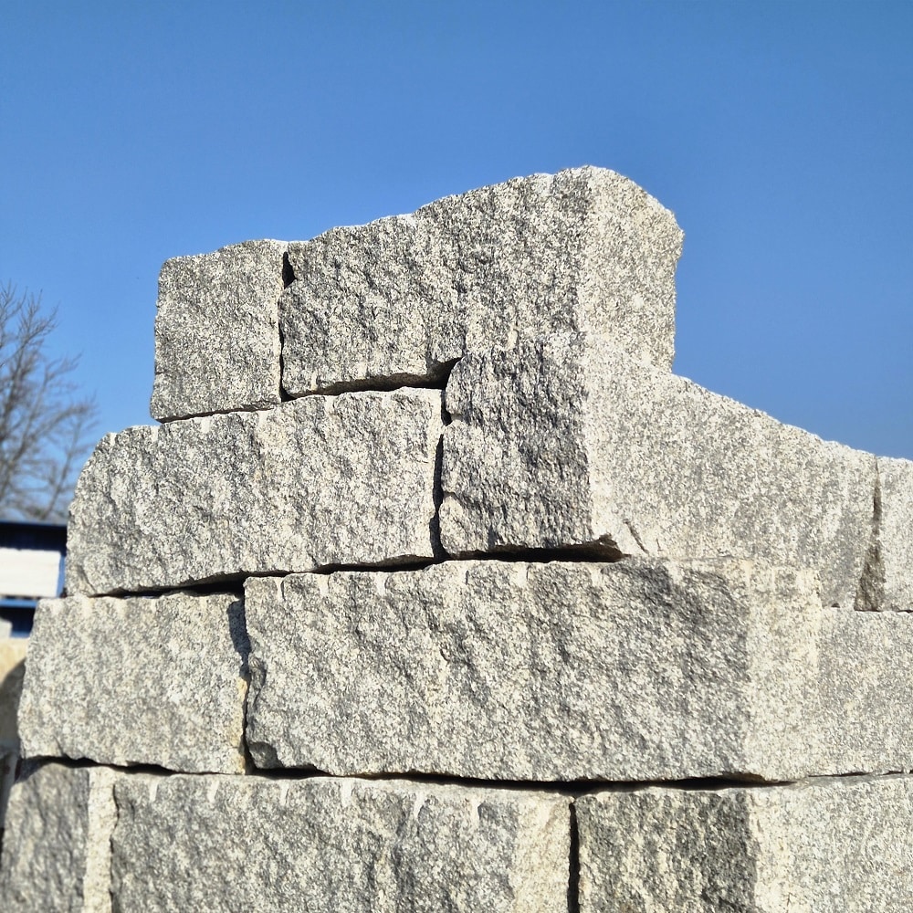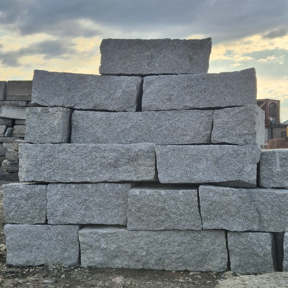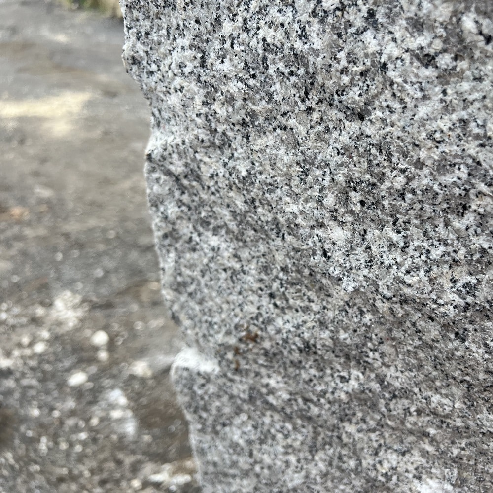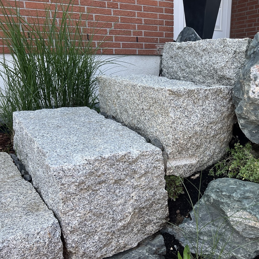 Das Farbspektrum dieses Granit Mauersteins reicht von weiß, über grau bis schwarz und sieht im Gesamtverband gräulich aus.