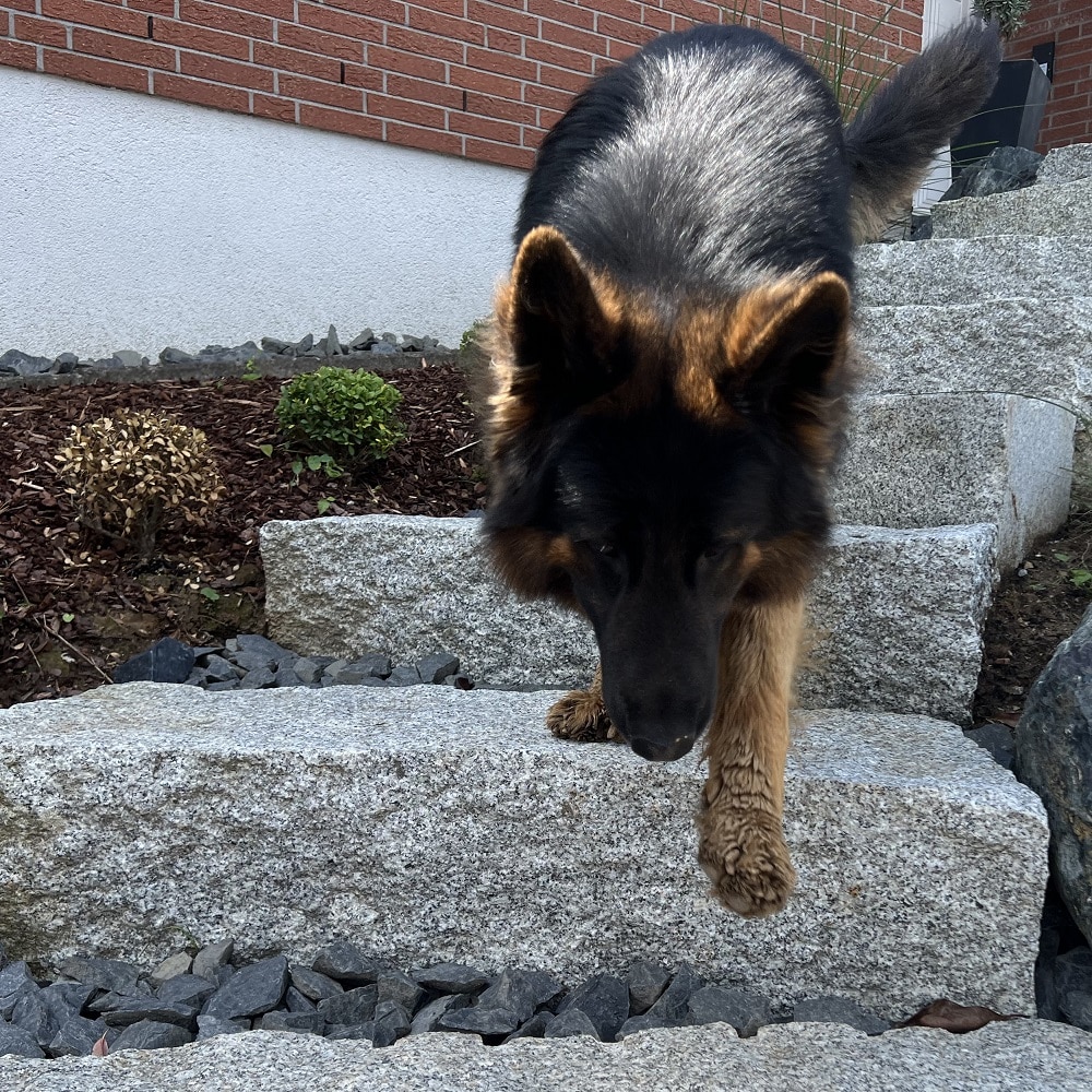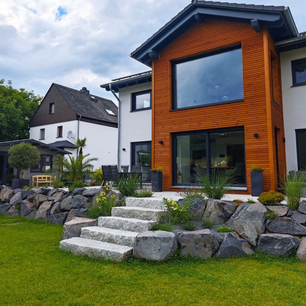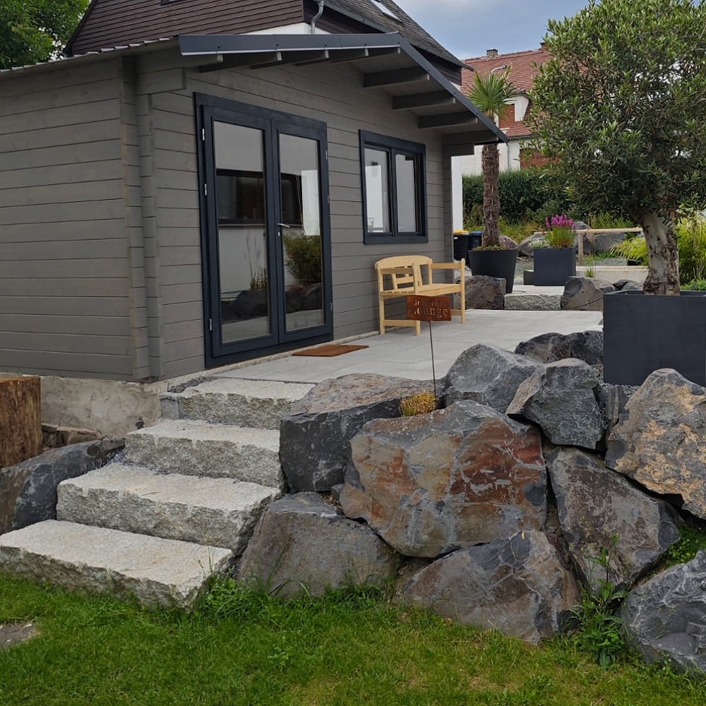 In den Beispielbildern Sehen Sie ein Grundstück mit Hangbefestigungen aus Basalt Bruchsteinen. Die Treppen wurden von uns mit Granit Quadern 40 erstellt.