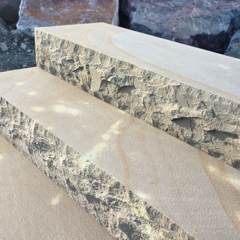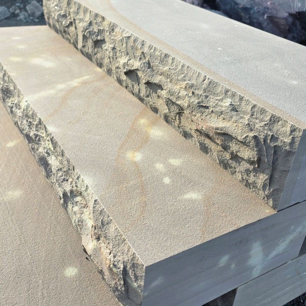Die handbossierte Sichtkante verleiht der Stufe einen charakterstarken, natürlichen Look, der zugleich rustikal und modern wirkt.