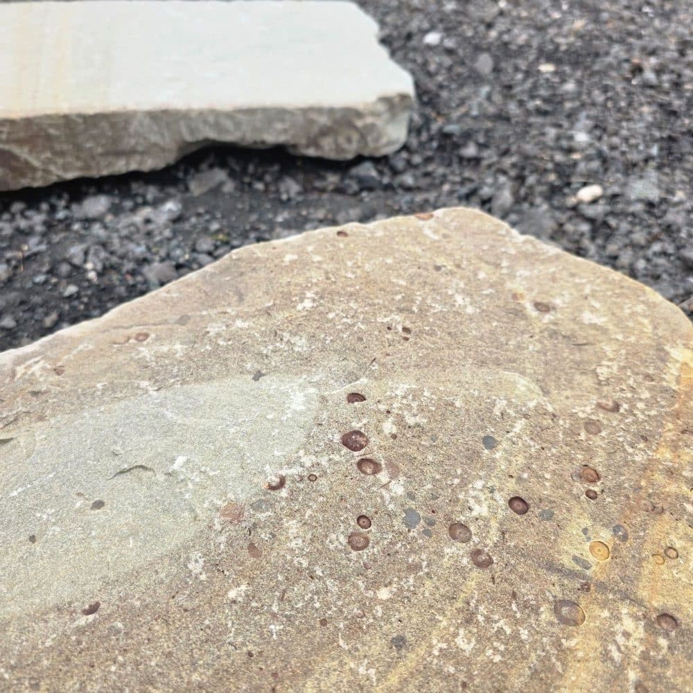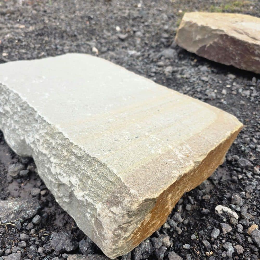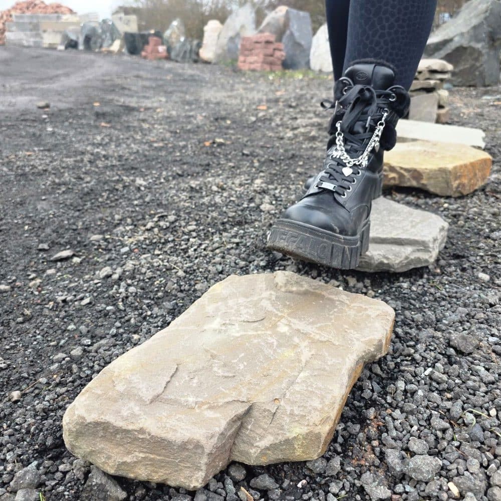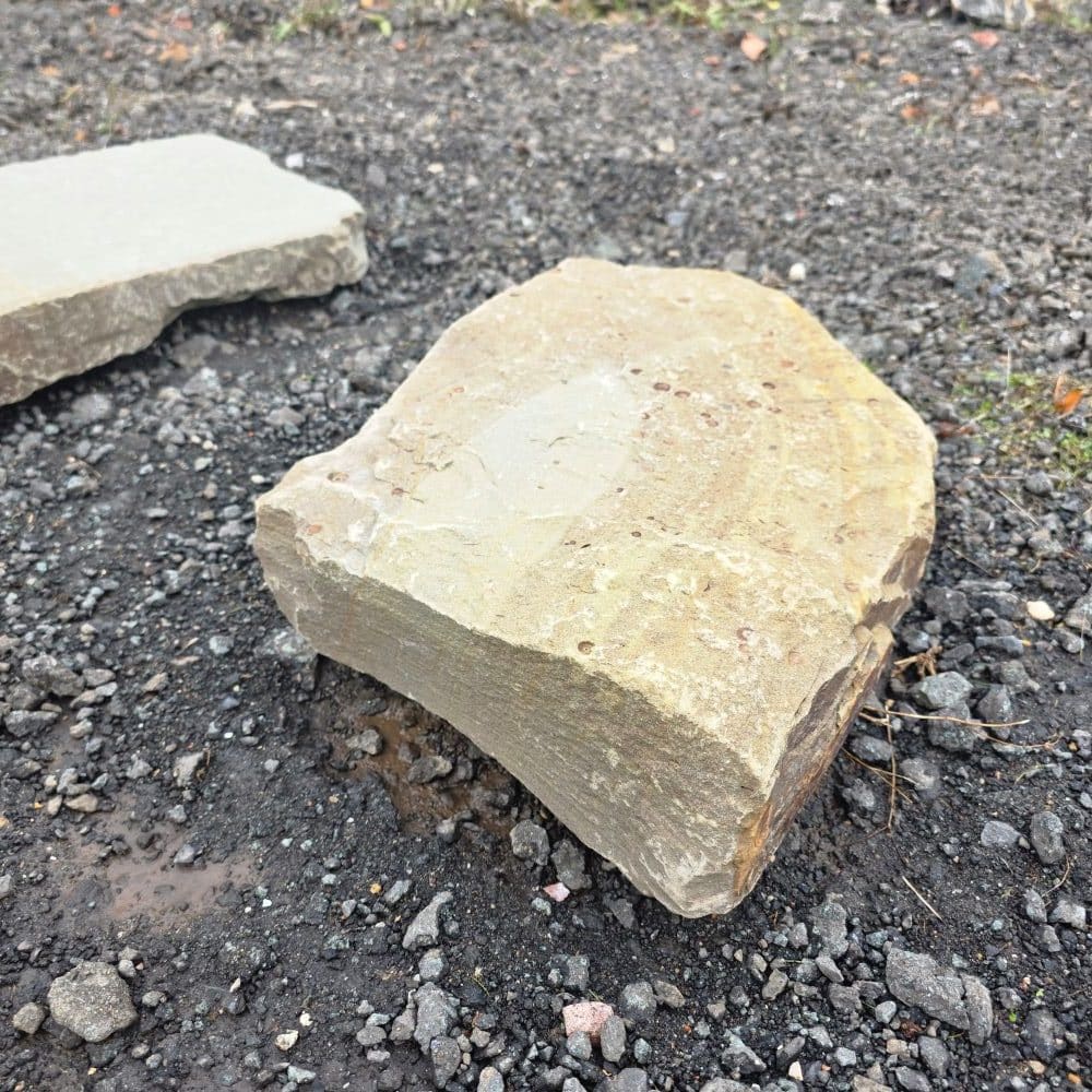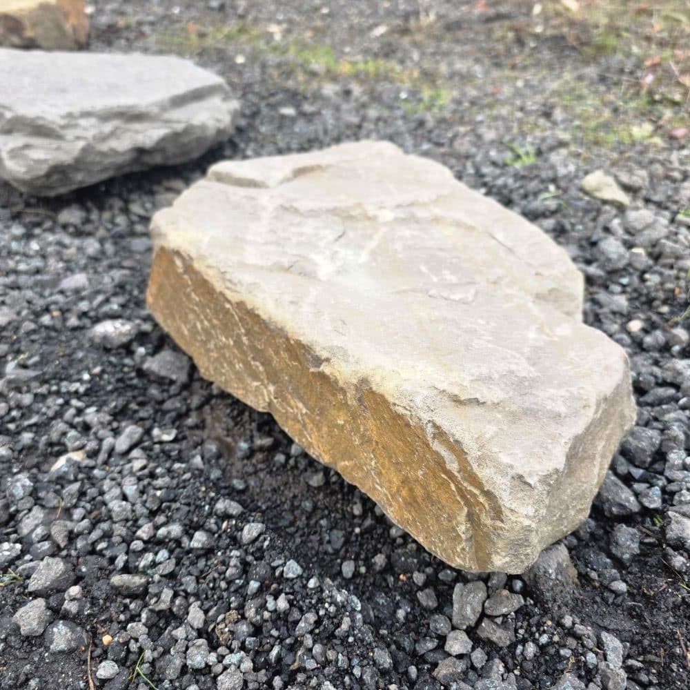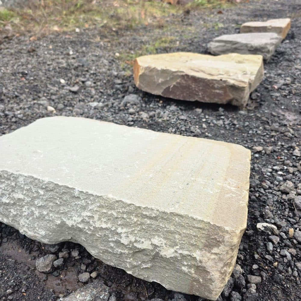 Die handliche Größe, das geringe Gewicht und der plattenartige Bruch sorgen dafür, dass sich die Steine schnell und einfach in ein Schotterbett ohne Betonfundament verlegen lassen.