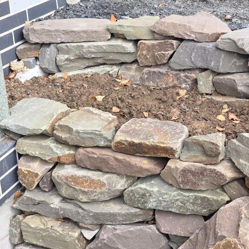 Erstellen Sie günstig eine rustikale Trockenmauer, die optisch ohne Abzüge mit einer Trockenmauer aus gespaltenen oder gesägten Quadern und Mauersteinen mithalten kann.
