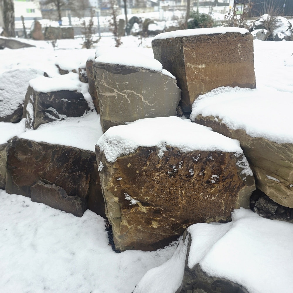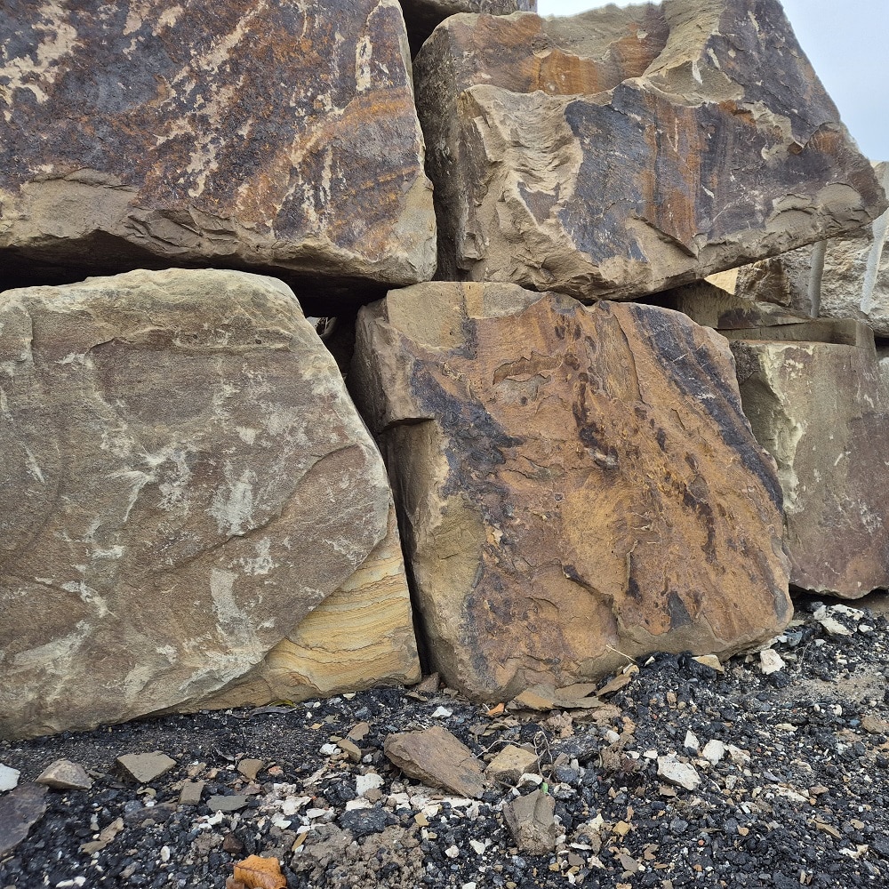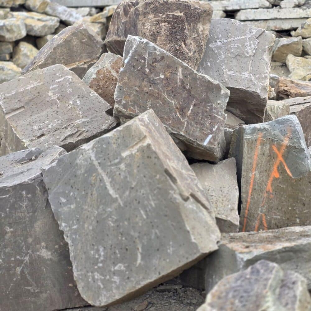 Der Großteil dieser natürlichen Naturstein Quader ist nicht bearbeitet. Manche Steine wurden kantig gebrochen und weisen Bohrspuren an den Bruchstellen auf.