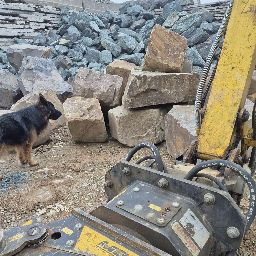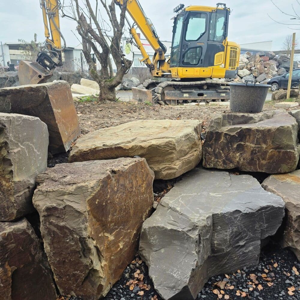 Ein guter Baggerfahrer versetzt auch diese Steinblöcke zu perfekten Trockenmauern.