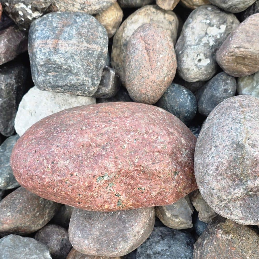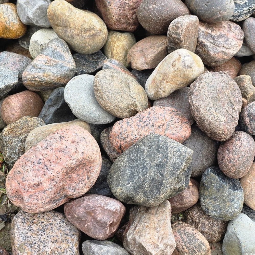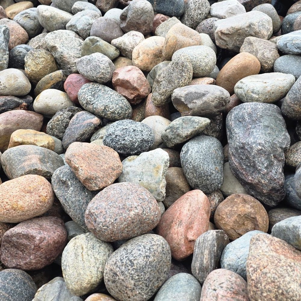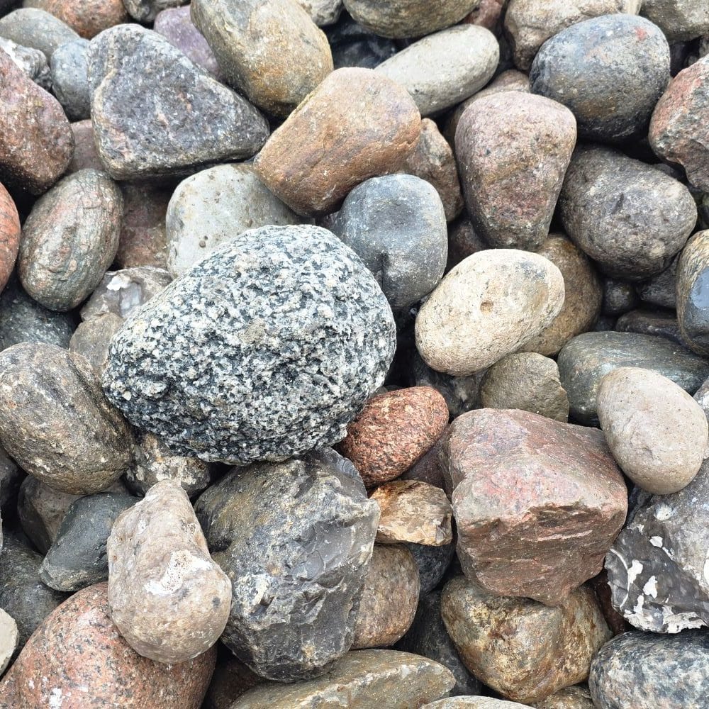 Die Steine bestehen überwiegend aus nordischem Granit in einer farbenfrohen Mischung – Rot-, Gelb-, Grau- und Weißtöne, teils gefleckt und mit natürlichen Kristalleinschlüssen. Durch den fehlenden Handsortierprozess können scharfkantigere Steine und Flintsteine enthalten sein, was jedoch für viele Einsatzzwecke ideal genutzt werden kann.