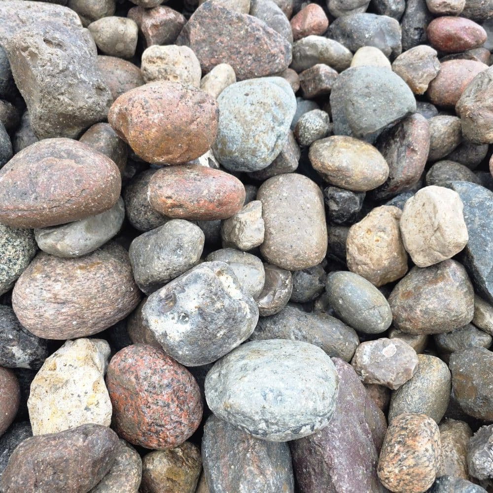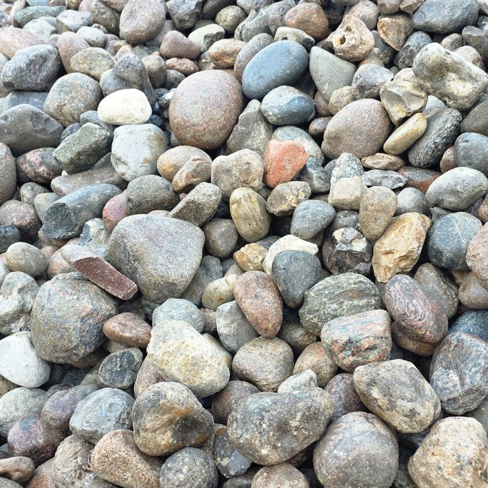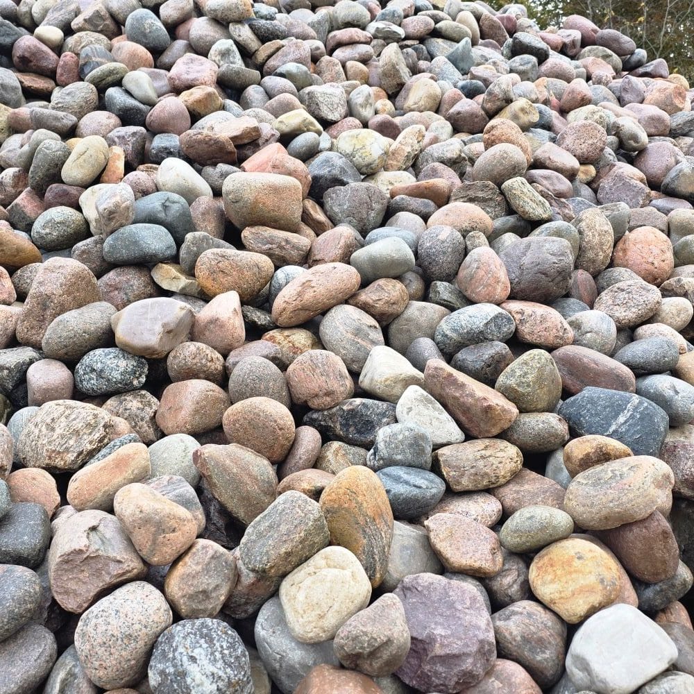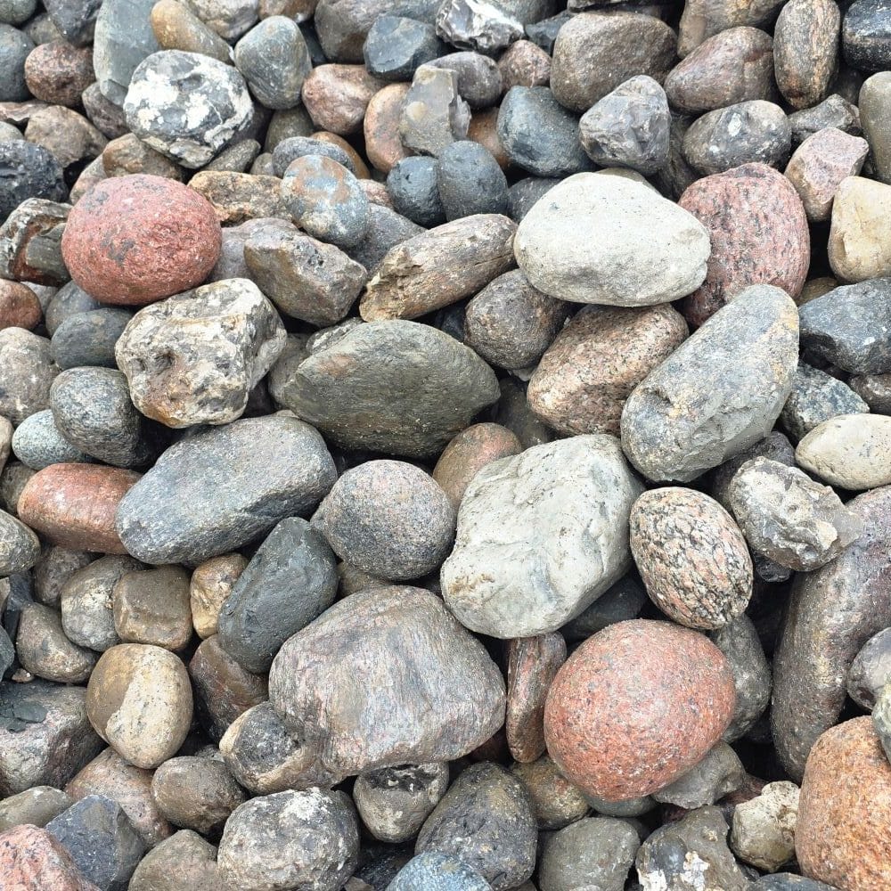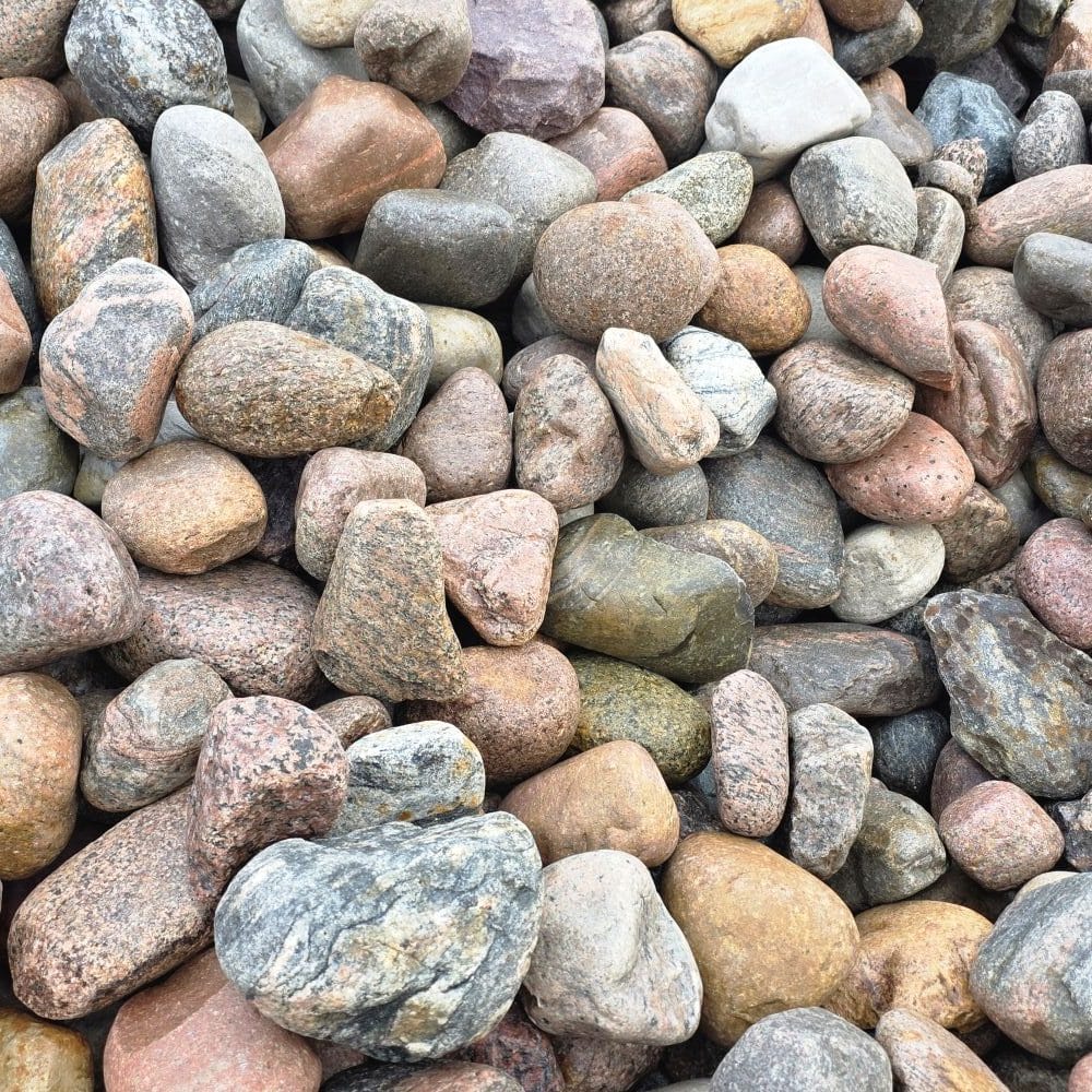 Die Steine bestehen überwiegend aus nordischem Granit in einer farbenfrohen Mischung – Rot-, Gelb-, Grau- und Weißtöne, teils gefleckt und mit natürlichen Kristalleinschlüssen. Durch den fehlenden Handsortierprozess können scharfkantigere Steine und Flintsteine enthalten sein, was jedoch für viele Einsatzzwecke ideal genutzt werden kann.