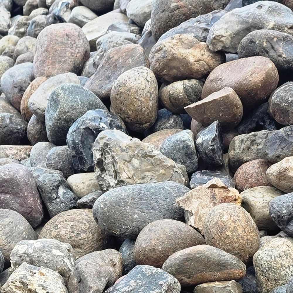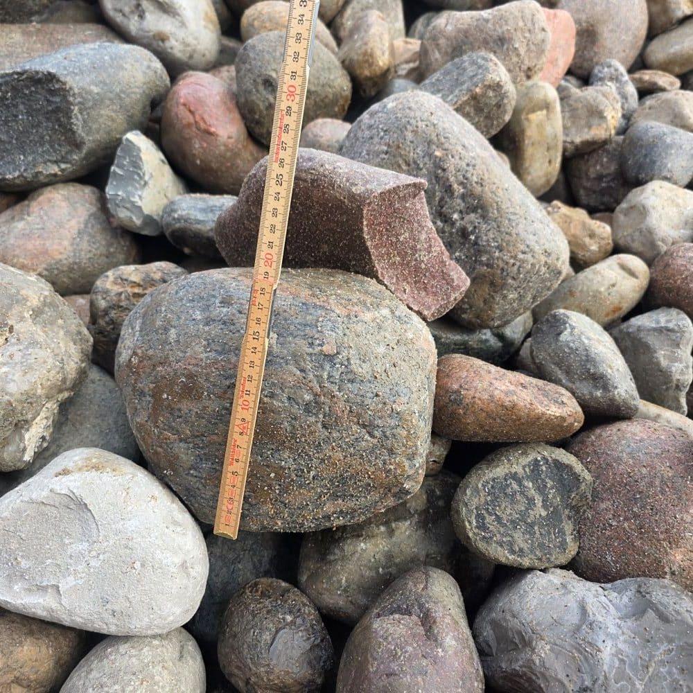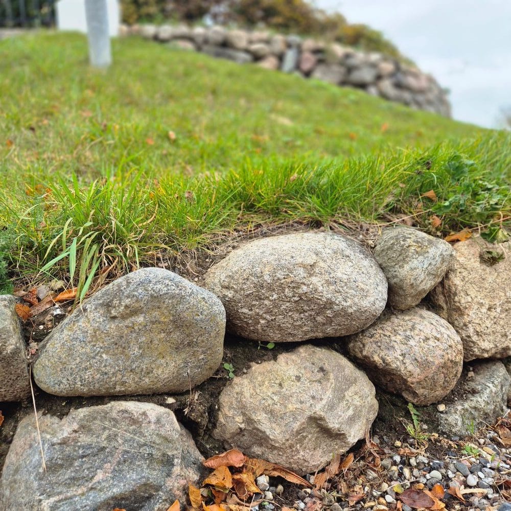 Unsere Jütlandfindlinge Deluxe sind die preiswerteste Sortierung für Friesenwälle im Format 150–300 mm. Sie entsprechen derselben Sieblinie wie die handsortierten Standardsteine, wurden jedoch nicht per Hand nachsortiert. Dadurch bleiben im Material ein kleiner Anteil Fremdgestein – überwiegend Flintsteine (Feuerstein) – sowie vereinzelt etwas kantigere Steine enthalten. Für die meisten Bauvorhaben stellt dies jedoch keinen Nachteil dar und bietet zugleich einen deutlichen Preisvorteil.