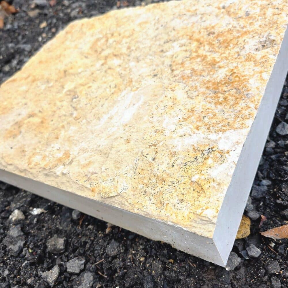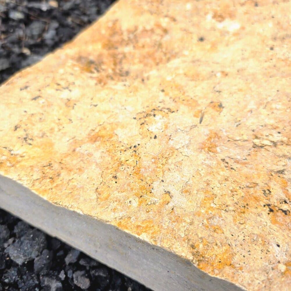 Die naturraue Oberfläche zeigt die typische Struktur des Jura Marmors mit warmen Beige- und Honigtönen sowie manchen fossilen Einschlüssen. Sie ist rutschhemmend und robust im täglichen Gebrauch.