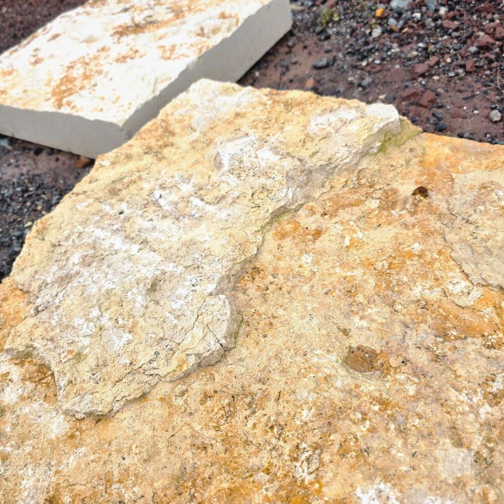 Diese großen rechteckigen Trittplatten aus Jura Marmor sind vielseitig einsetzbar. Ob großzügiger Gartenweg, lockerer Pfad durch den Rasen oder markanter Einzeltritt im Kiesbett, das Format wirkt ruhig, klar und hochwertig.