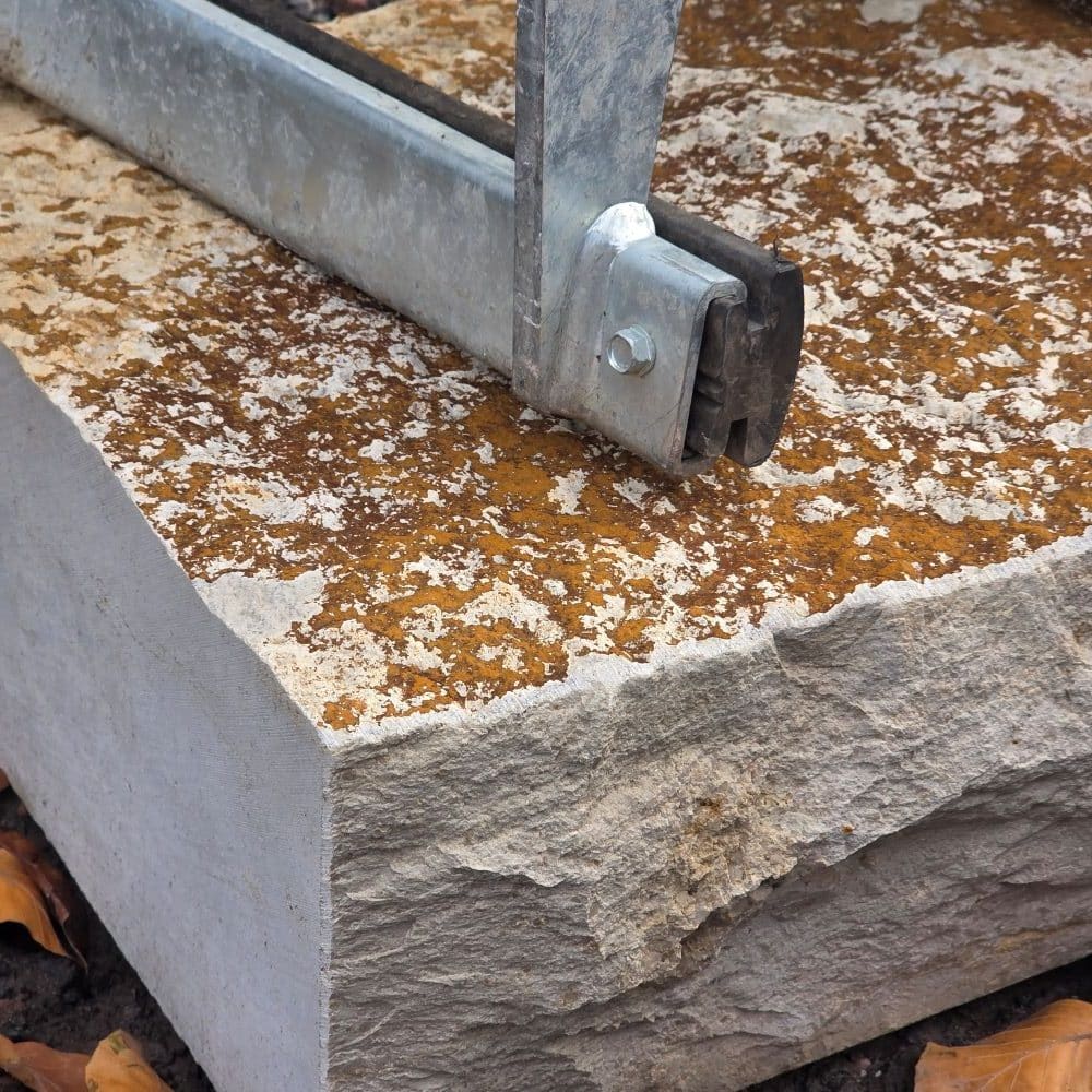 An allen Einbauflächen ist die Steinstufe gesägt. Die vordere Ansichtsseite ist gespalten, das bedeutet das bei der Bearbeitung grobe Bruchstellen hervorgerufen werden, die eine naturnahe Optik schaffen.