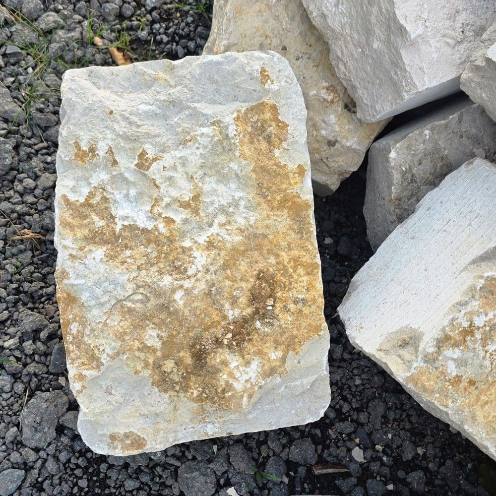 Dieser Mauerstein, mit einem durchschnittlichen Gewichten von rund 35 bis 50 kg und einzelnen Exemplaren von bis zu 80 kg, ist der größere der 2 losen Sortierungen der Jura Marmor Klassik Reihe mit gesägten Köpfen.