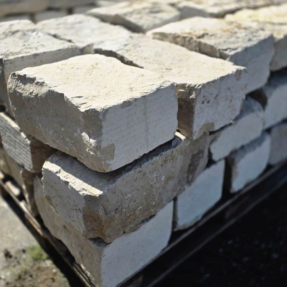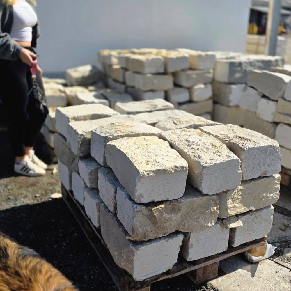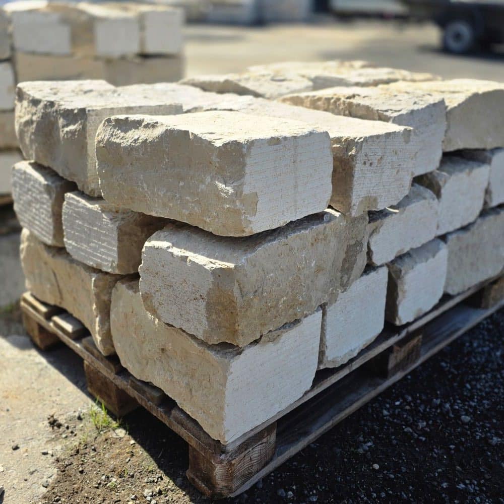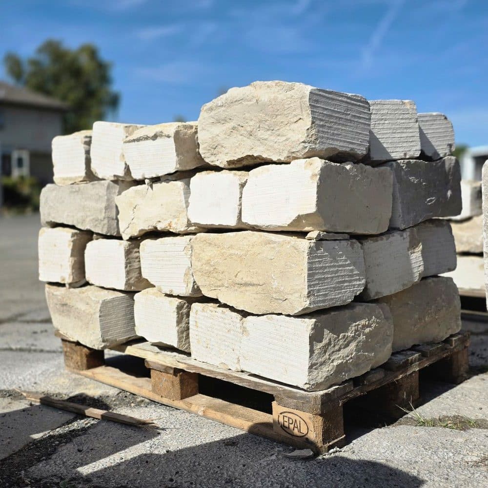 Der Jura Marmor klassik Mauerstein wird auf Paletten geliefert.