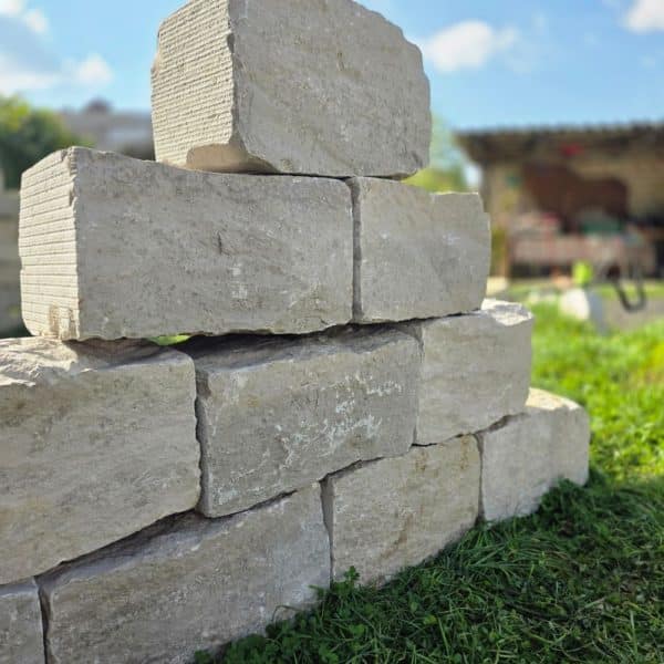 Auf Wunsch kann der beige Stein lose zusammen mit kleineren Formaten – zum Beispiel Mauersteinen mit einer Höhe von 10–20 cm – geliefert werden.
