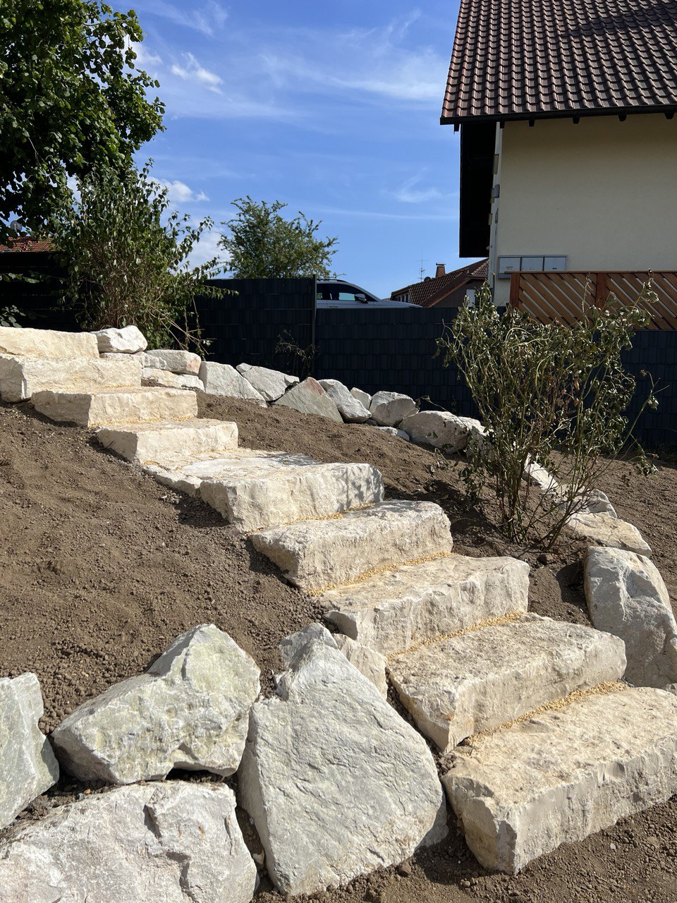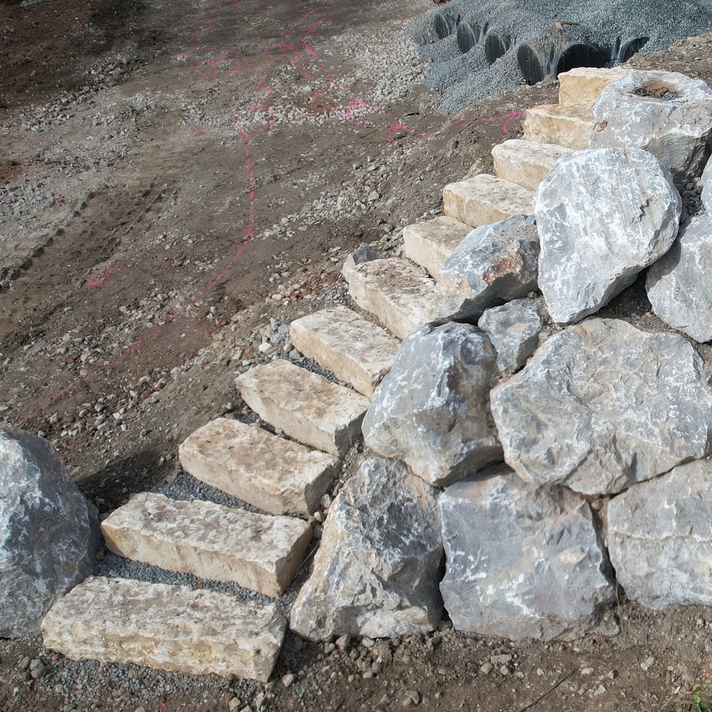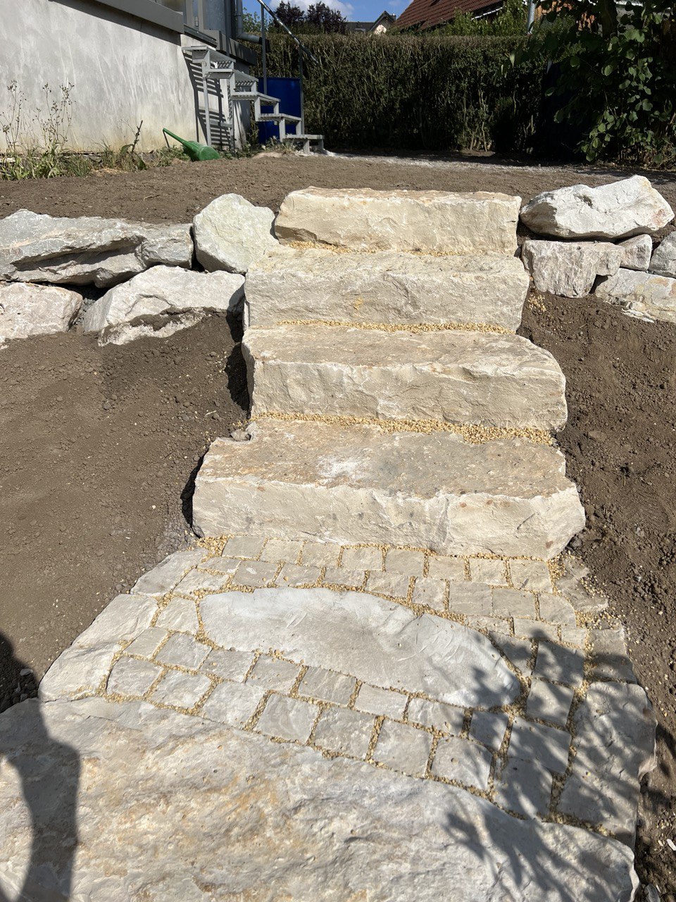 Als Untergrund reicht eine verdichtete Tragschicht aus Schotter. Gesetzt werden die Naturstufen am besten trocken in 8-16mm Drainagesplit.