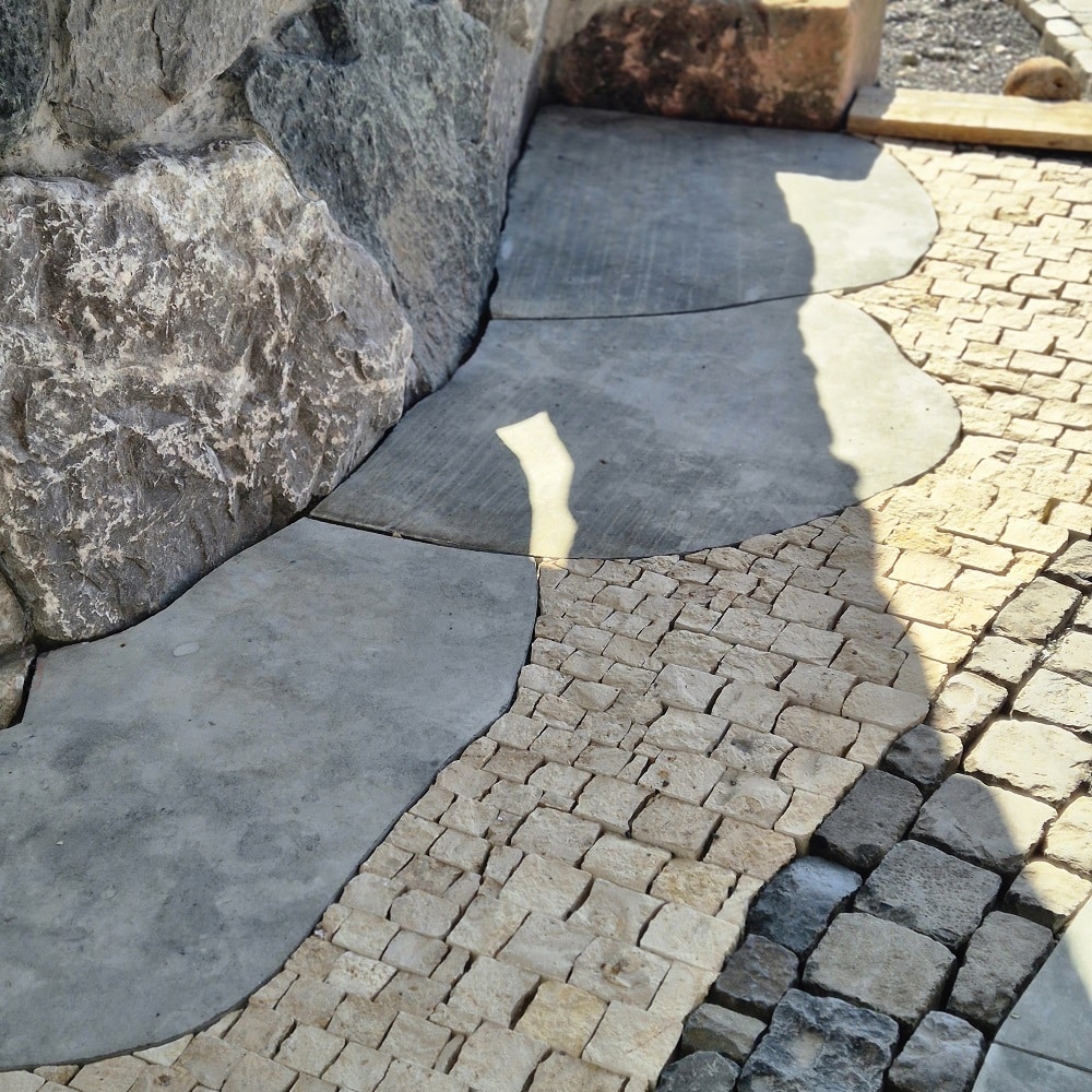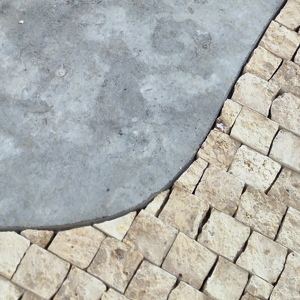 3. Mischung: Bringen sie Farbe in Ihre Pflasterflächen. Kombinieren Sie diese Mosaik Naturstein Pflaster mit größeren oder andern Steintypen. Gerade dunkle Steine harmonieren in einen tollen Kontrast zum Jura Marmor.