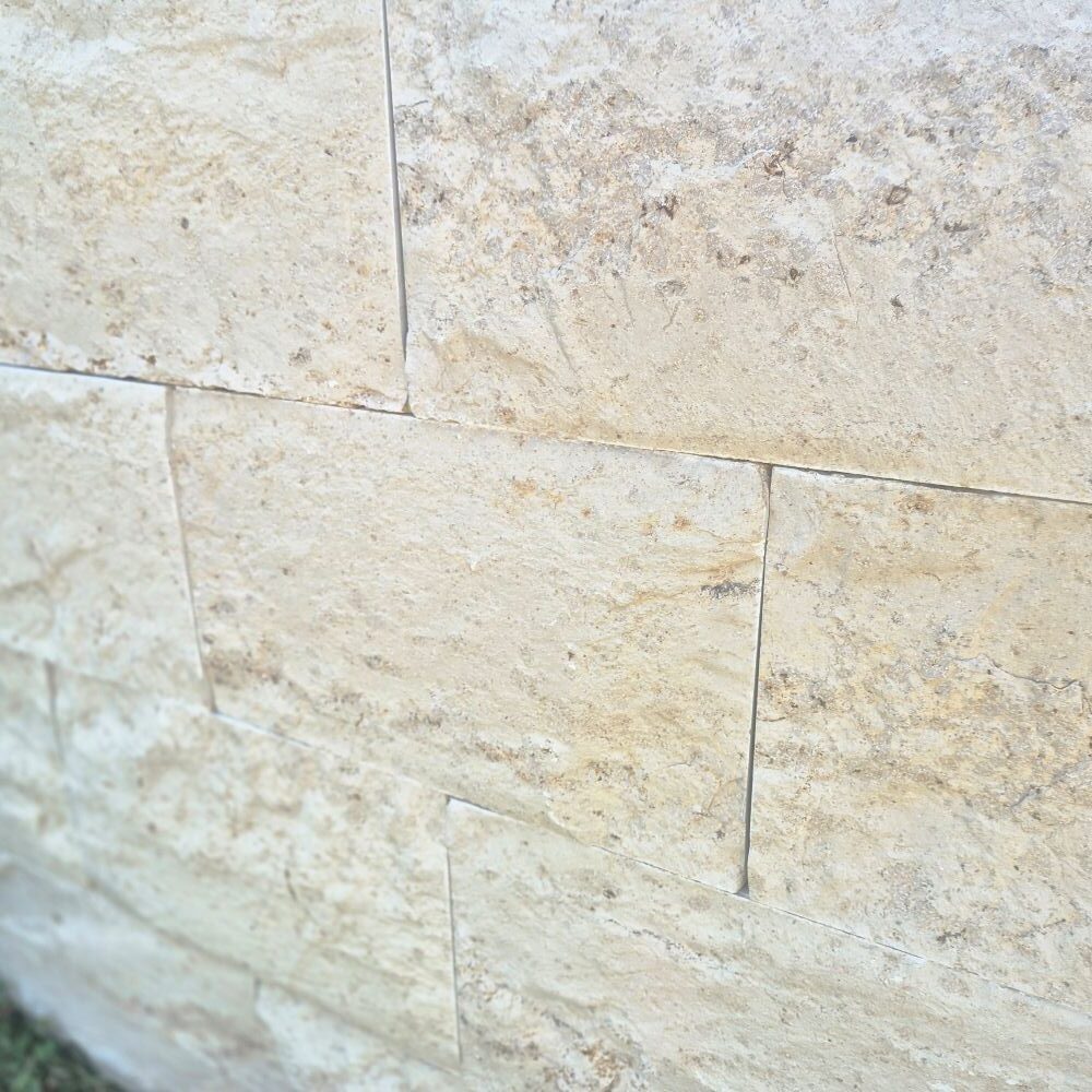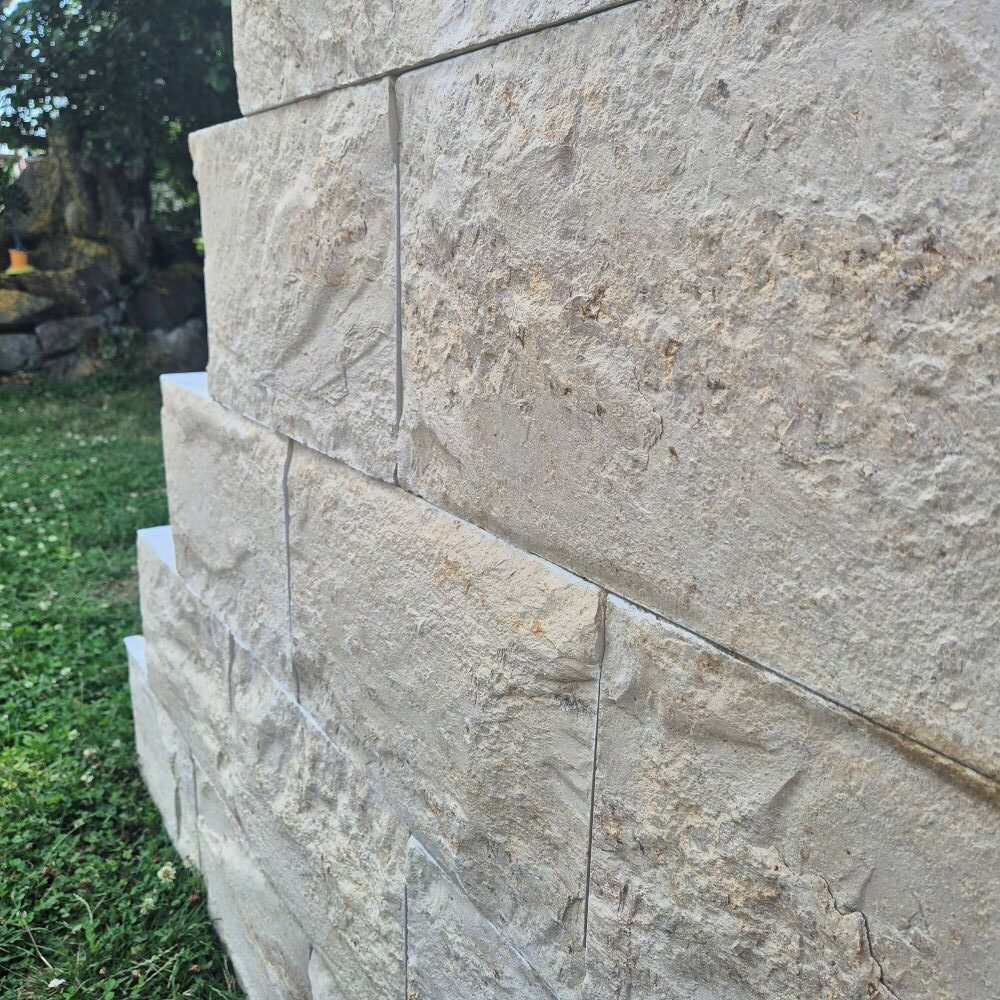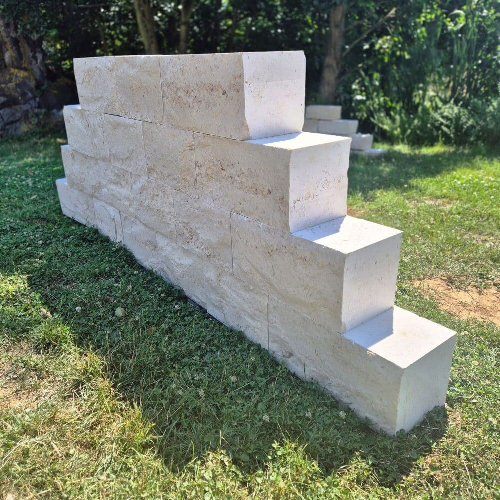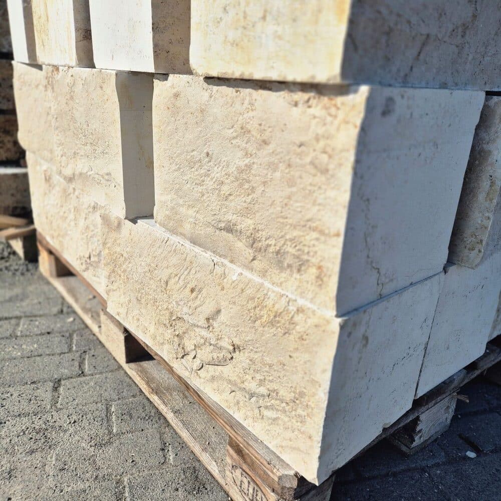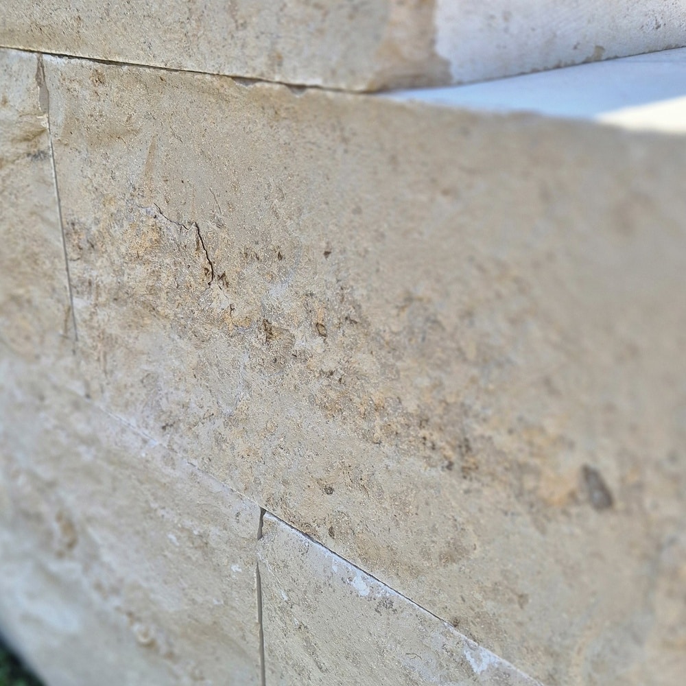 Die gespaltene Vorderansicht unterstreicht die natürliche Ausstrahlung der Jura Marmor Quader.