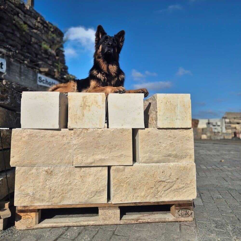 Die 25cm hohen Steine eignen sich bestens für höhere Hangabfangungen und stilvolle Trockenmauern. Mit Ihrem Gewicht von meist etwa 50kg sind die Jura Marmor Quader noch per Hand händelbar.