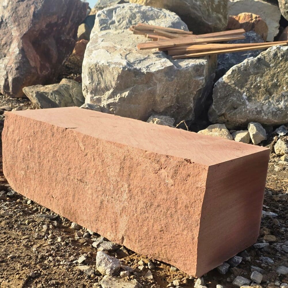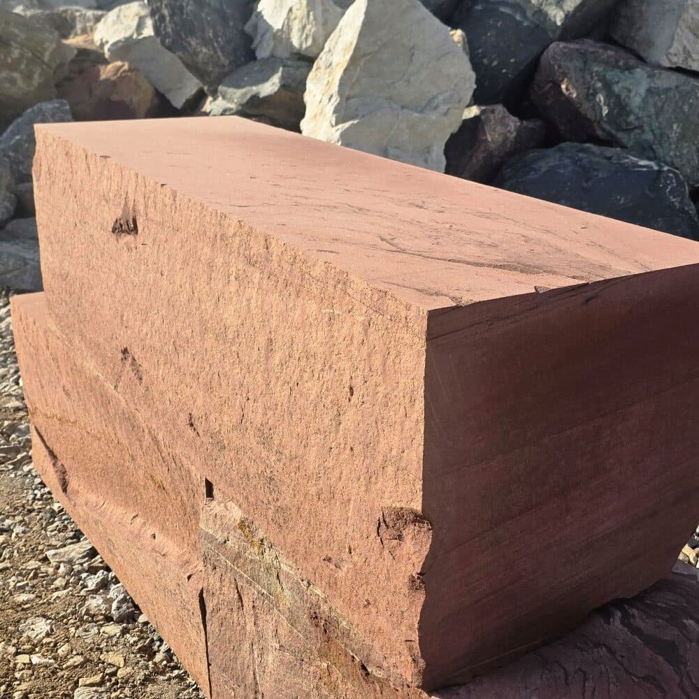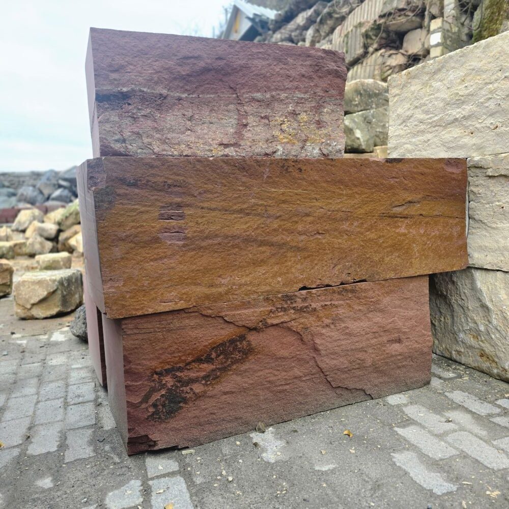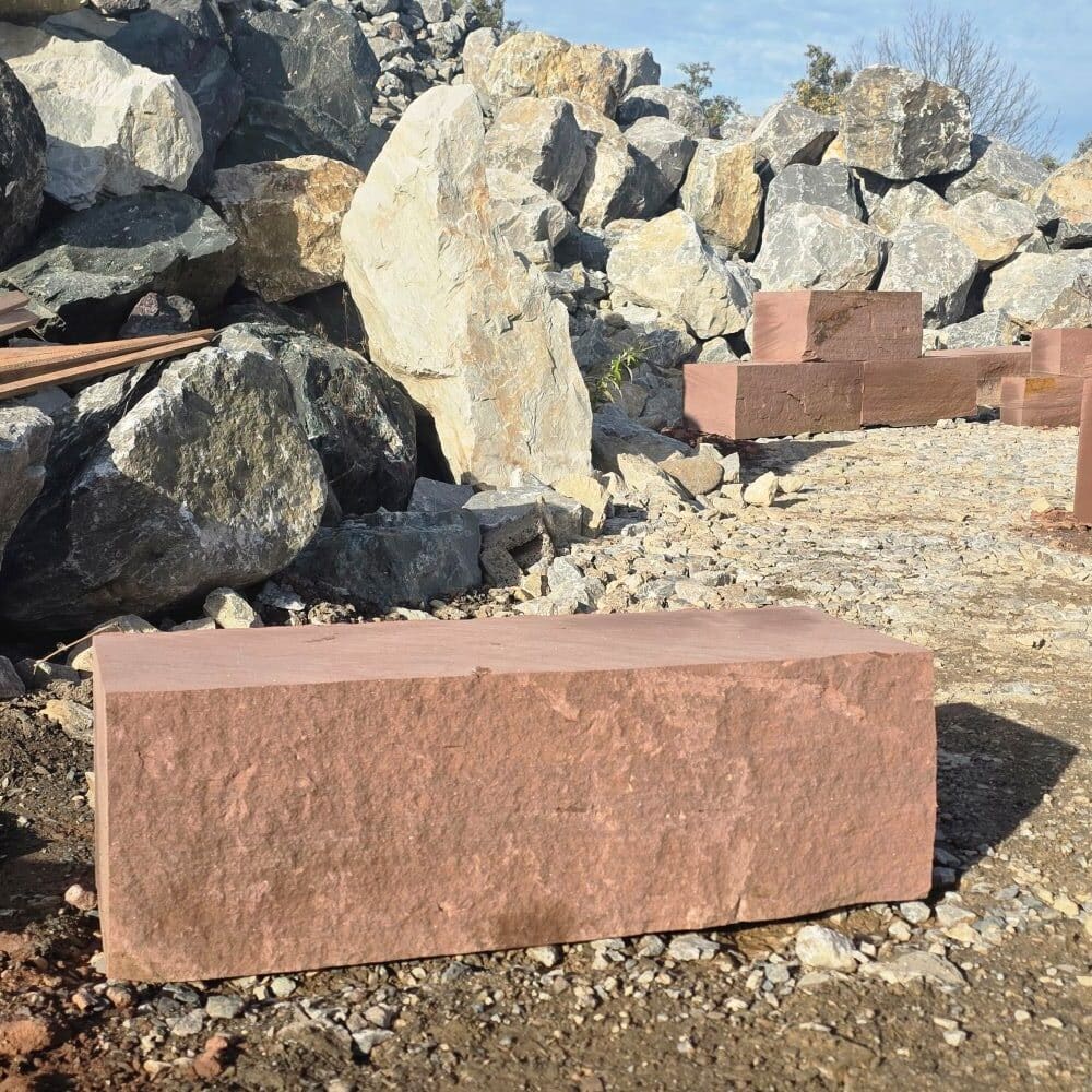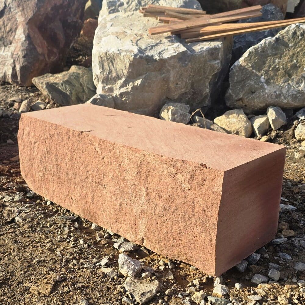 Roter Naturstein Quader 40 cm mit gesägten Fugen und naturrauer Sichtfläche für massive Stützmauern