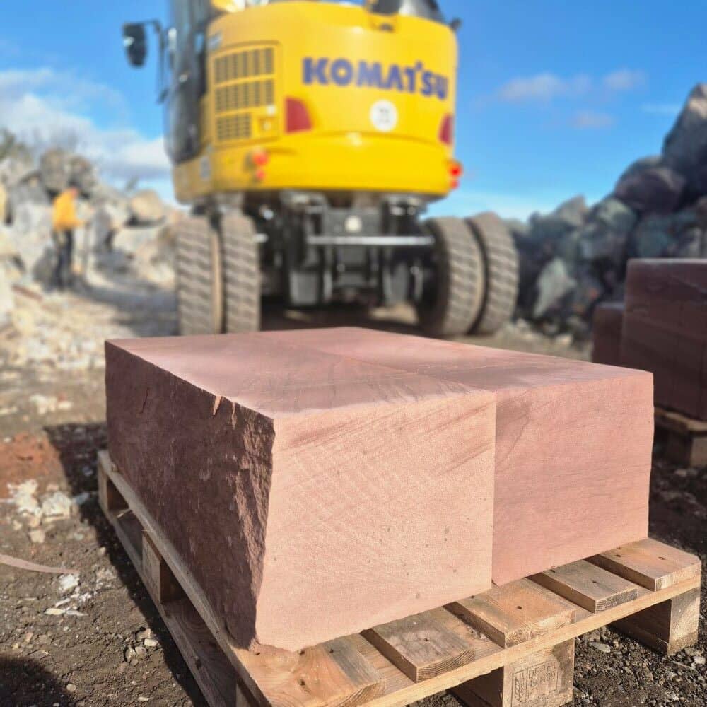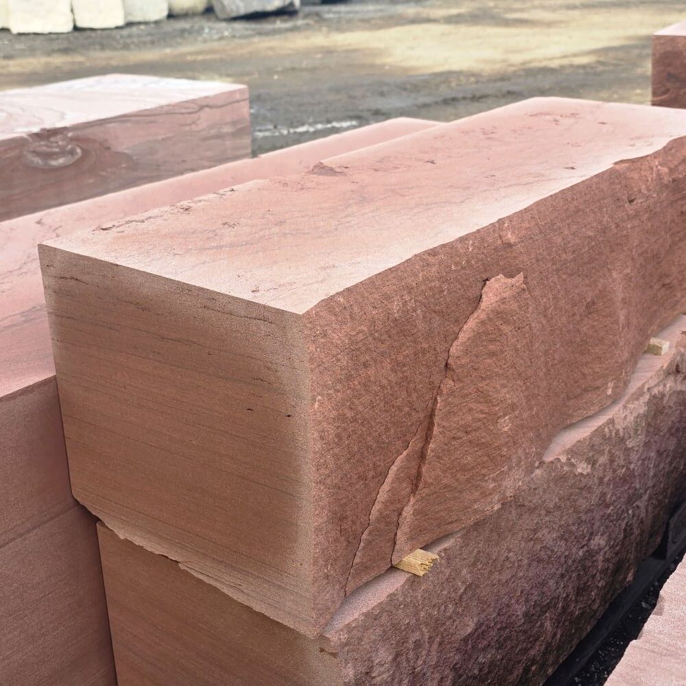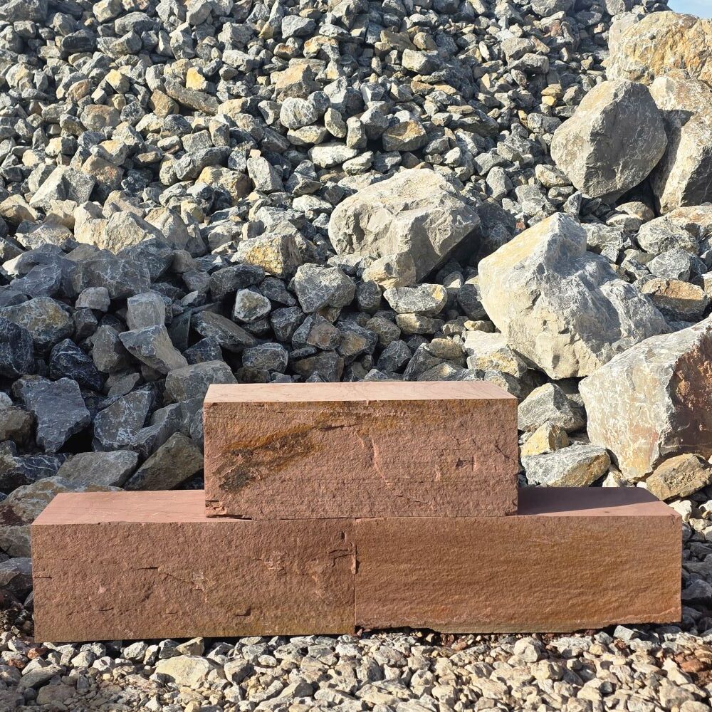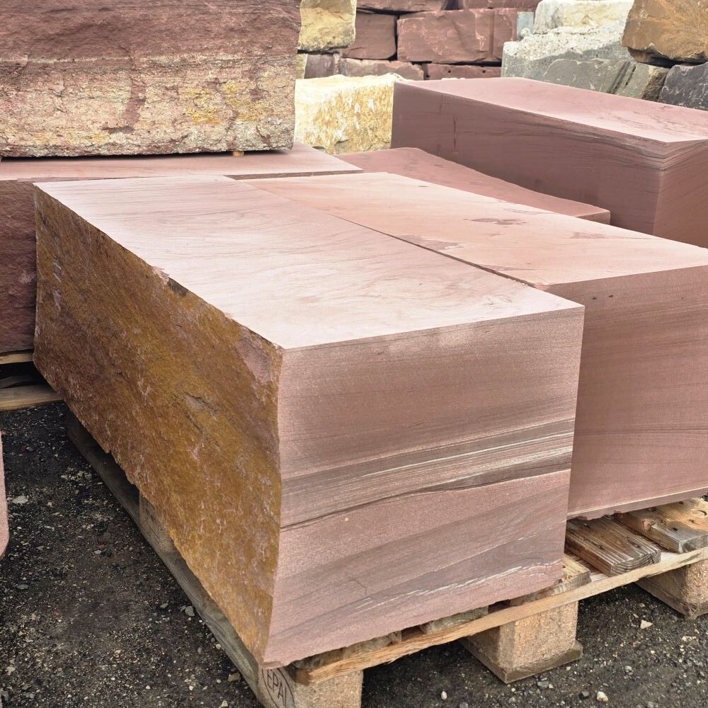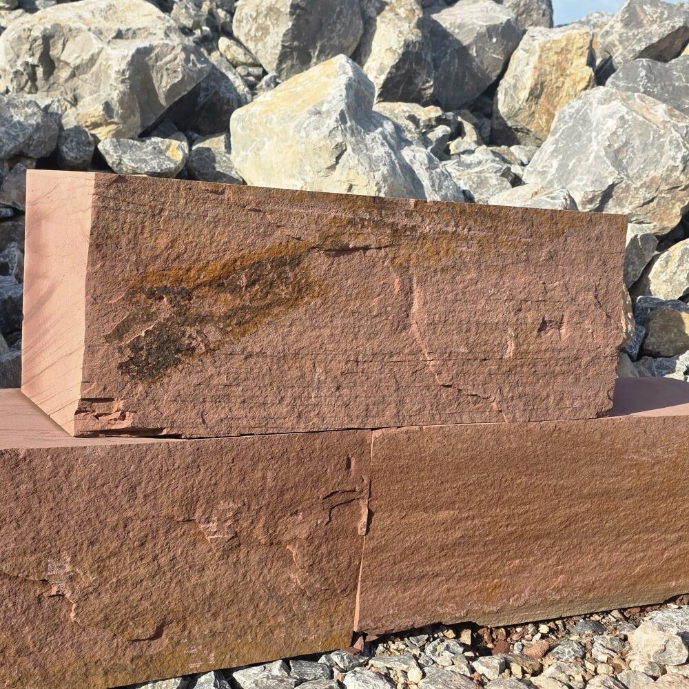 Roter Naturstein Quader 40 cm mit gesägten Fugen und naturrauer Sichtfläche für massive Stützmauern