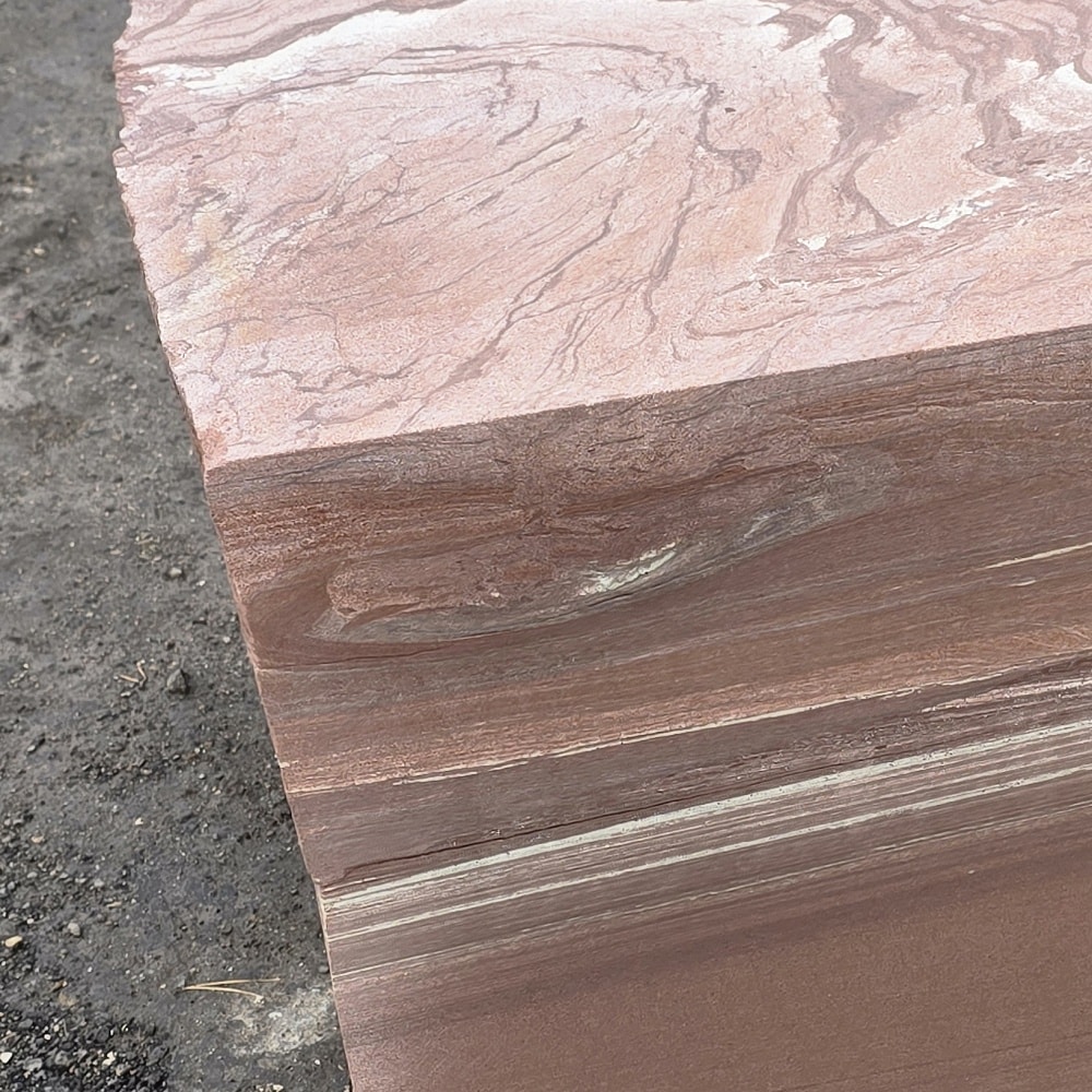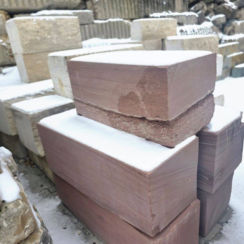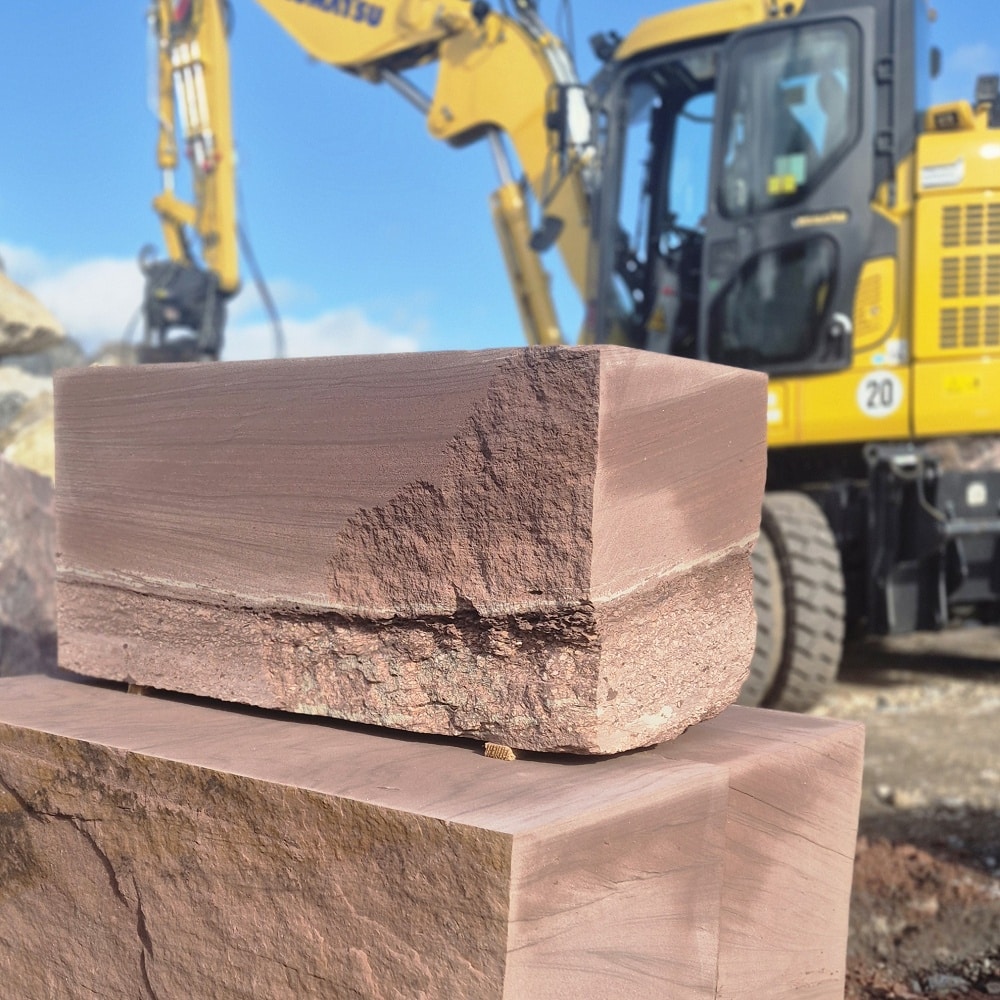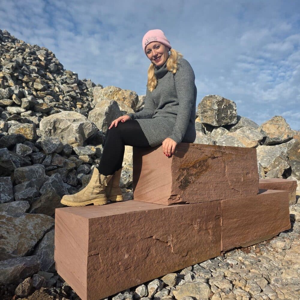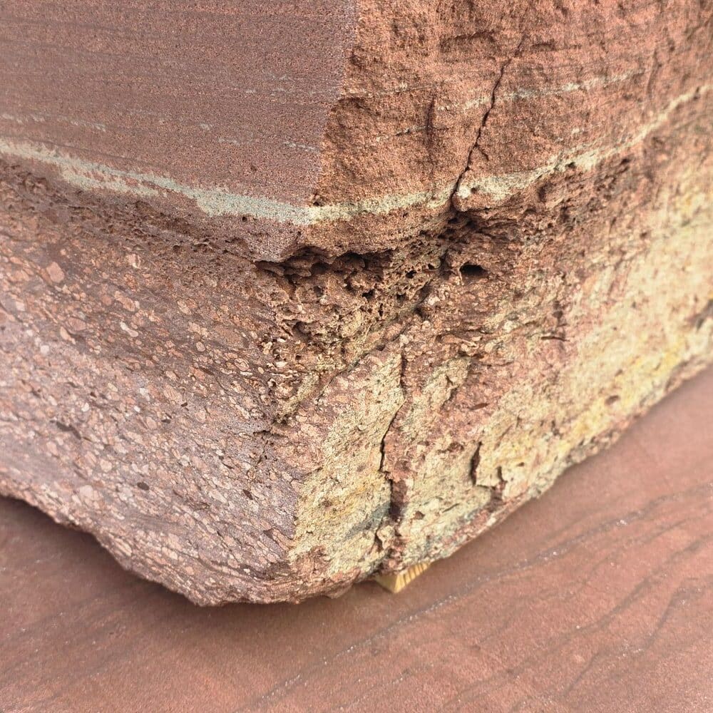 Roter Naturstein Quader 40 cm mit gesägten Fugen und naturrauer Sichtfläche für massive Stützmauern