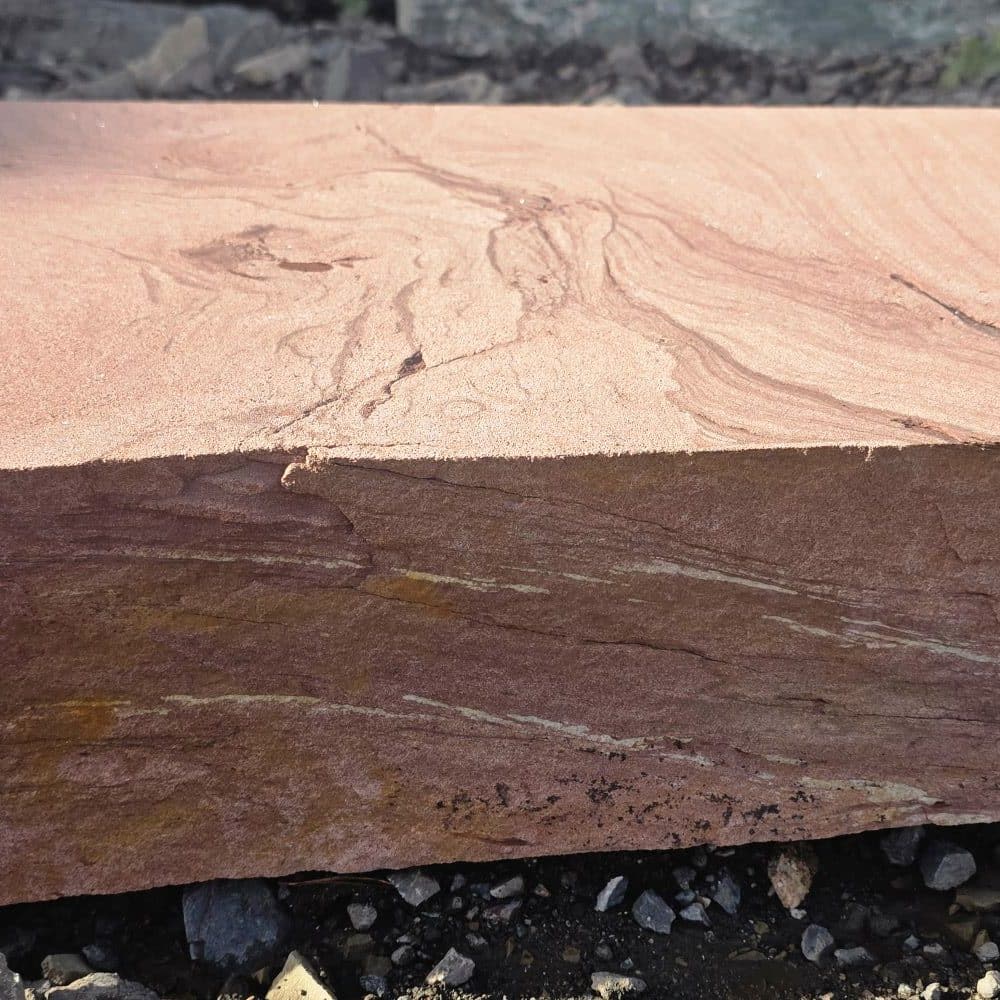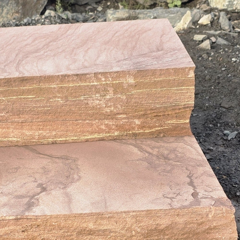 Die gesägte Ober- und Unterseite sorgt für eine exakte Auflage und sauberen Tritt, während die naturraue Vorderseite den authentischen Charakter des Sandsteins bewahrt.