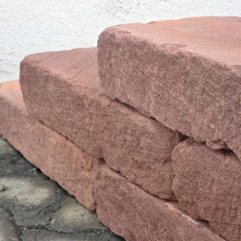 Der warme, rötliche Farbton des echten Mainsandsteins sorgt für eine angenehme, mediterrane Atmosphäre und fügt sich harmonisch im Garten und Landschaftsgestaltung ein.