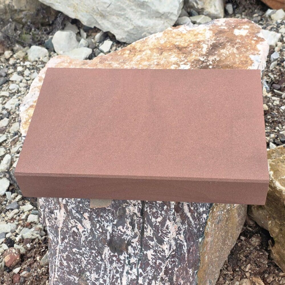Die warme, rötliche Farbgebung und die feinkörnige Struktur verleihen Wegen, Beeten und Hofbereichen eine hochwertige Natursteinoptik.