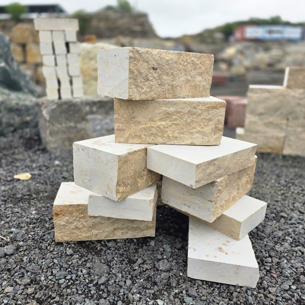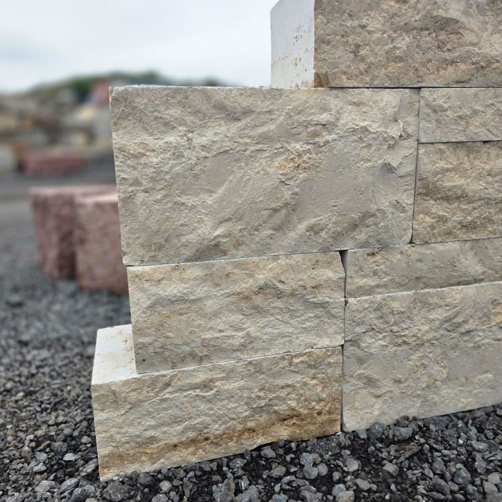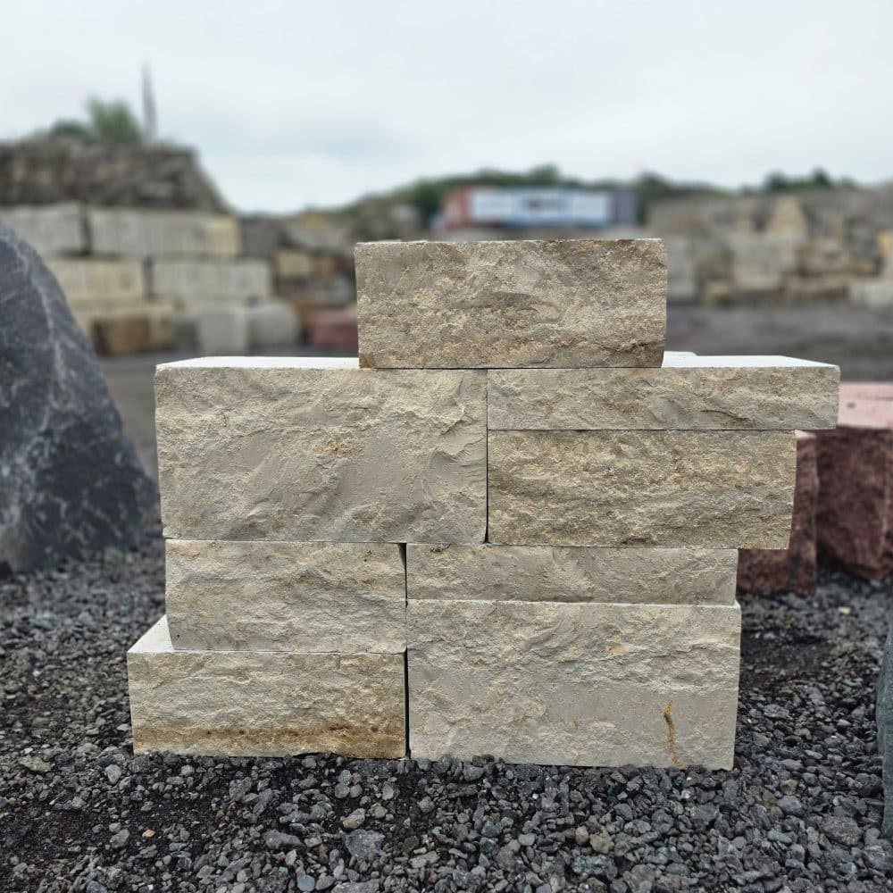 Diese Naturstein Mauersteine werden auf Paletten geliefert.