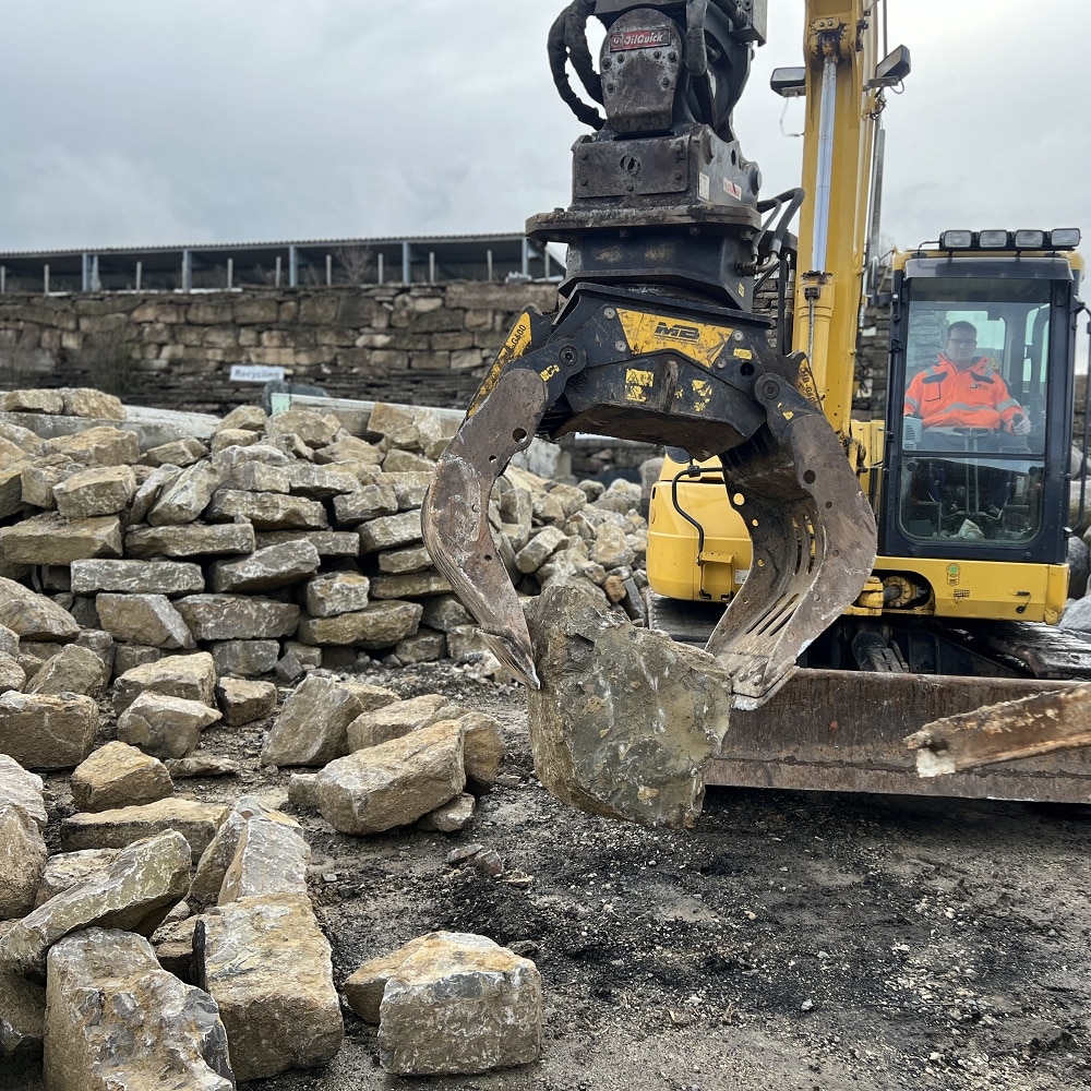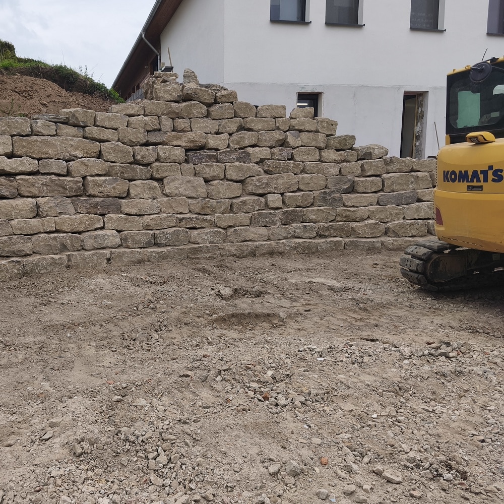 Mit Einzelgewichten bis 900 kg entstehen besonders stabile Natursteinmauern mit klassischer Quadermauer-Optik.