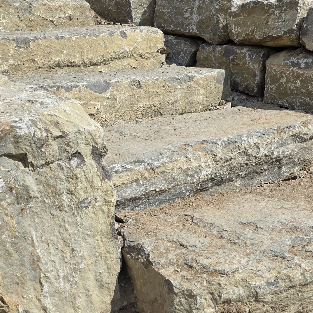 Die flachen und relativ tiefen Steine sind ideal als rustikale Natursteinstufen aus Muschelkalk geeignet.