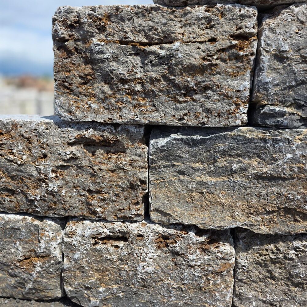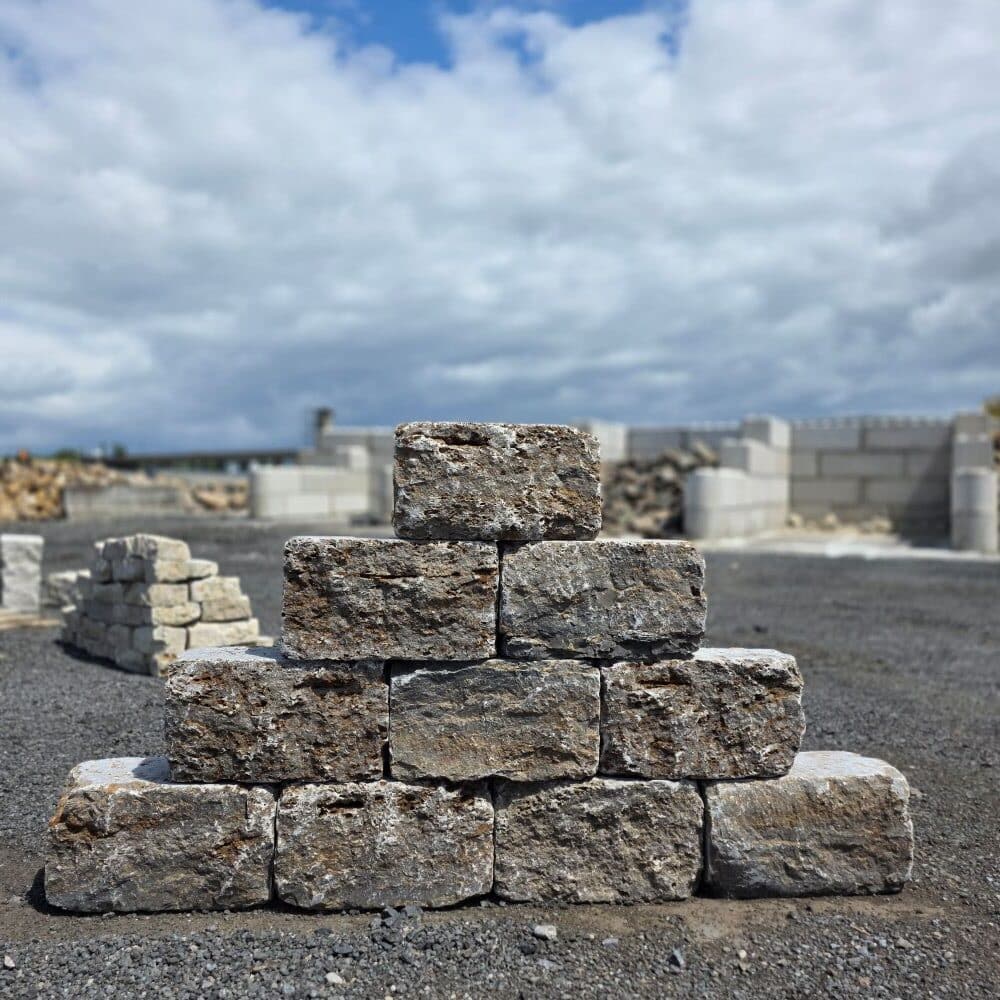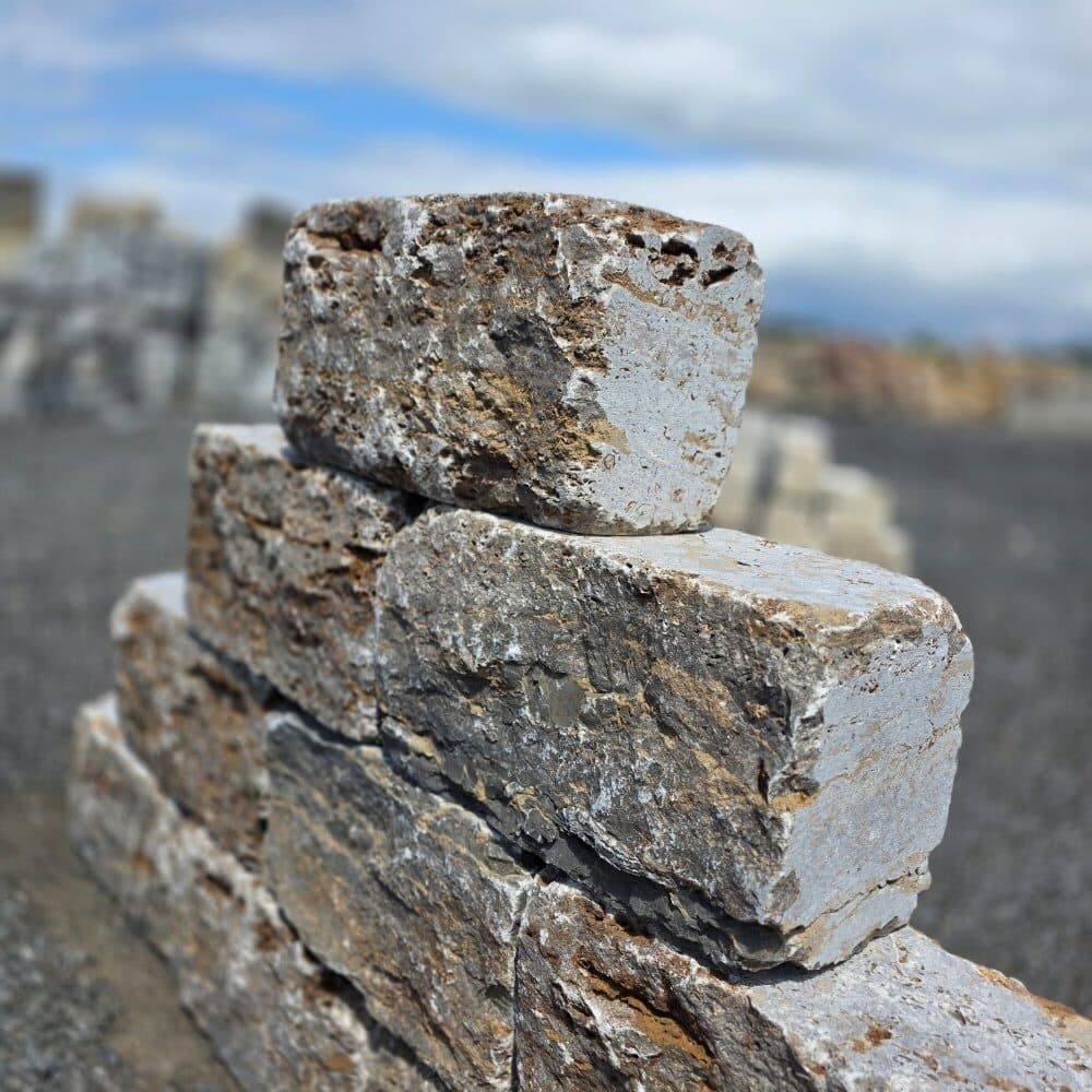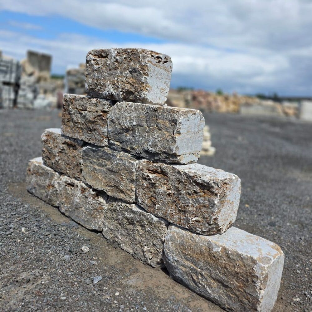 Diese Naturstein Mauersteine werden auf Paletten geliefert.