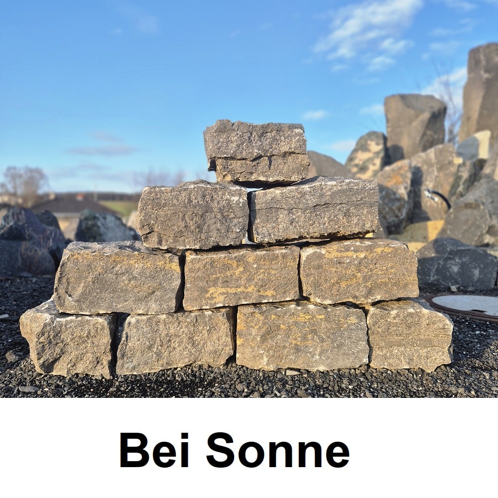 Dieser handliche Mauerstein ist nicht immer gleich. Die beige graue Farbe und Stärke des Materials können von Stein zu Stein und von Charge zu Charge unterschiedlich sein. Wir raten vor dem Kauf einen vor Ort Termin mit uns zu vereinbaren, um sich das Material anzuschauen.