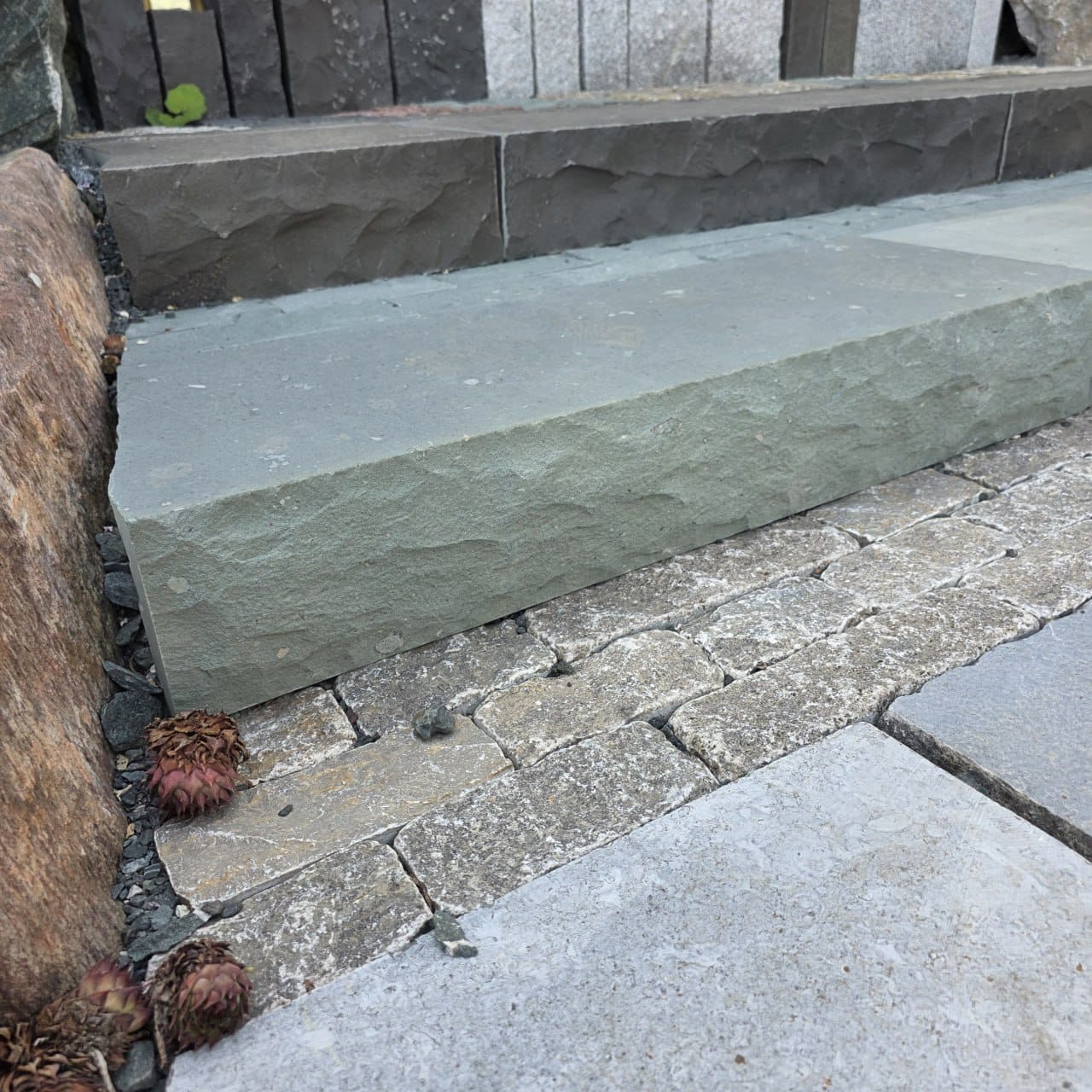 Die robusten Muschelkalk Steine lassen sich sowohl mit der geschnittenen Kannte (also glatte Oberfläche) sowie mit der gespaltenen Oberfläche (rutschfest) verlegen.