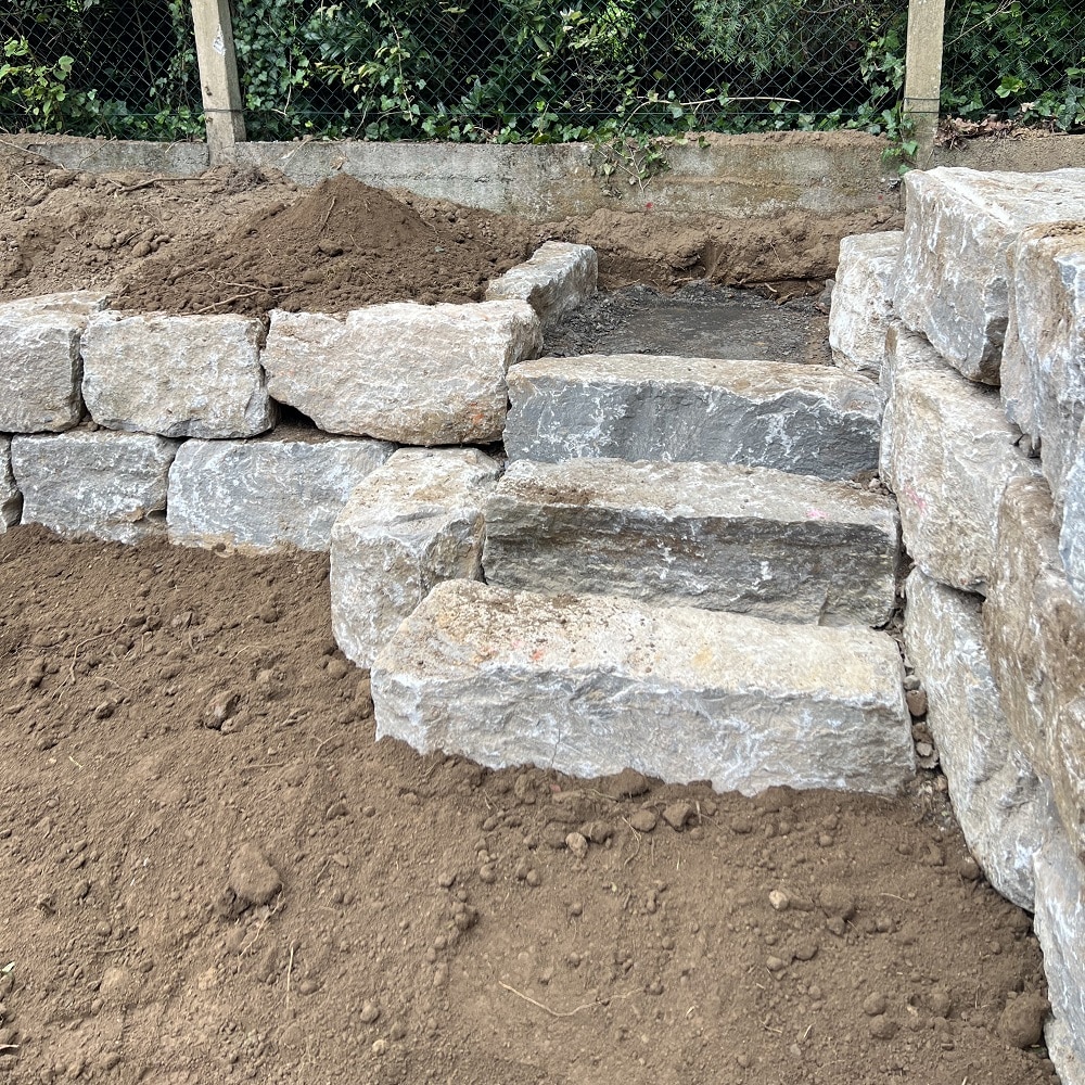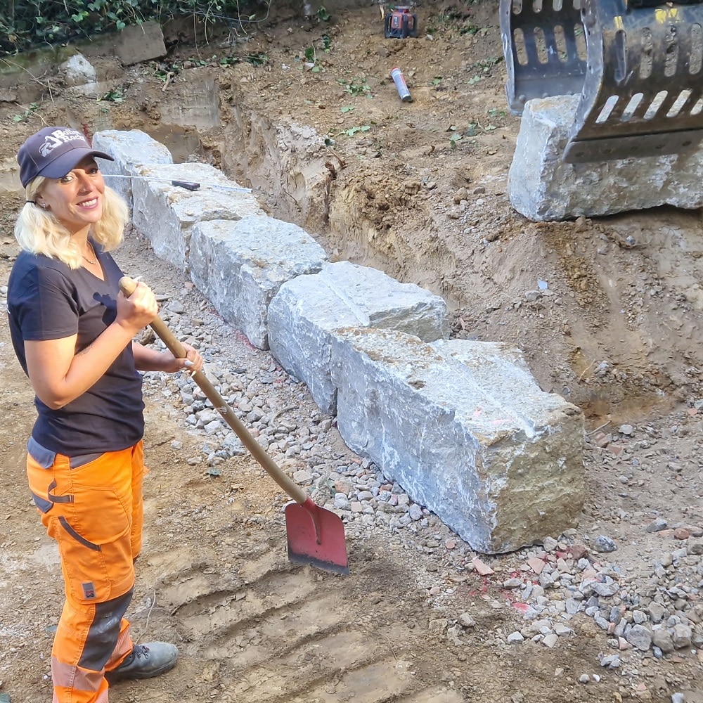 Die Steine mit der Standard Höhe von etwa 35cm und Gewichten von im Schnitt ca. 300 kg lassen sich mit allen gängigen Minibaggern ab 2500 kg verbauen.