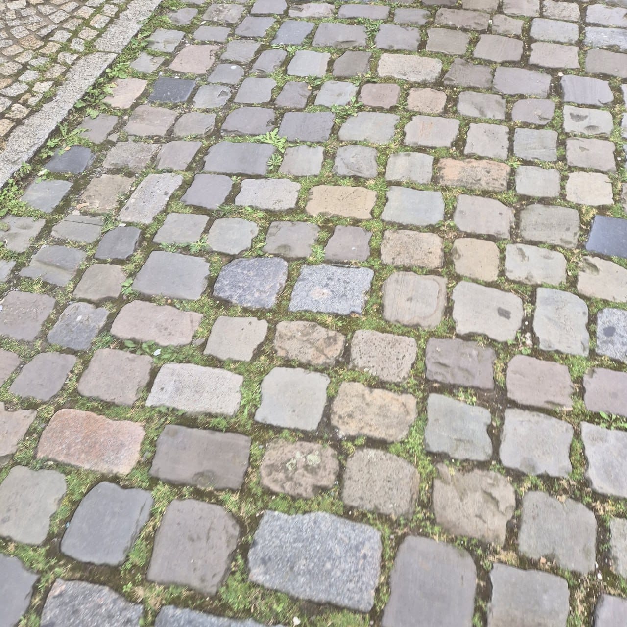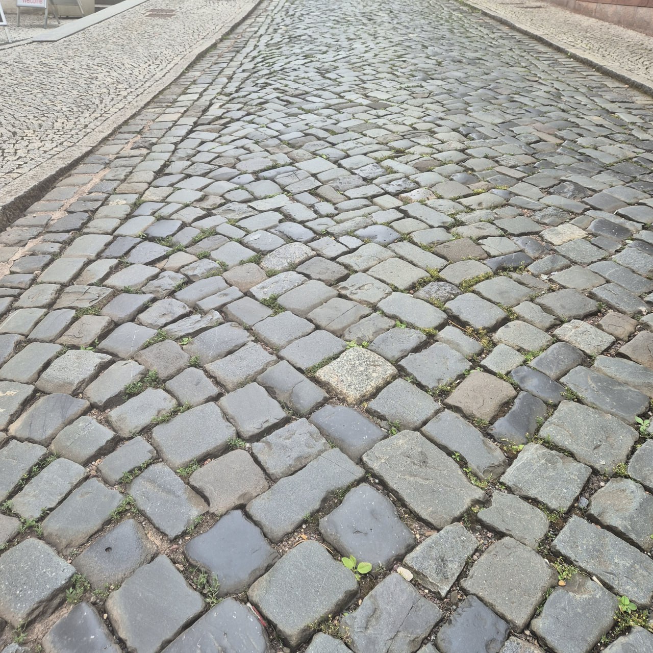Dieses Pflaster wurde bereits abgefahren und besitzt deshalb abgeflachte Kanten.