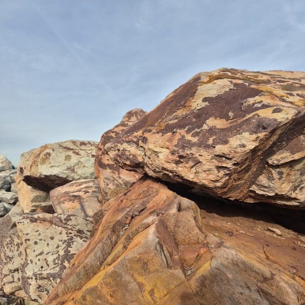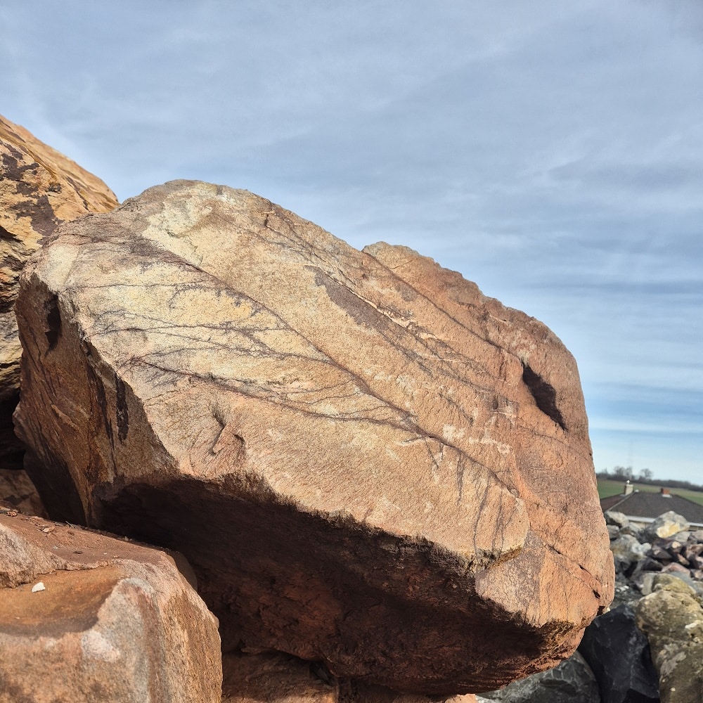 Beim Abkippen können Ecken abbrechen und die Steine beschädigt werden. Hierbei sollten Sie beachten, dass dieser tolle Findling bis er auf Ihrer Baustelle ankommt mindestens schon drei Mal mit Geräten wie Baggern oder großen Radladern aufgeladen und anschließend wieder abgekippt wurde. Sein natürliches Gesamterscheinungsbild wird davon aber nicht beeinträchtigt.