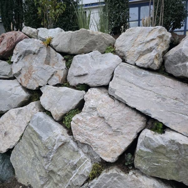Diese großen Steine können einen steilen Hang besonders freundlich und stabil abfangen. Stützmauern und Gartenmauern können Trocken gesetzt werden.
