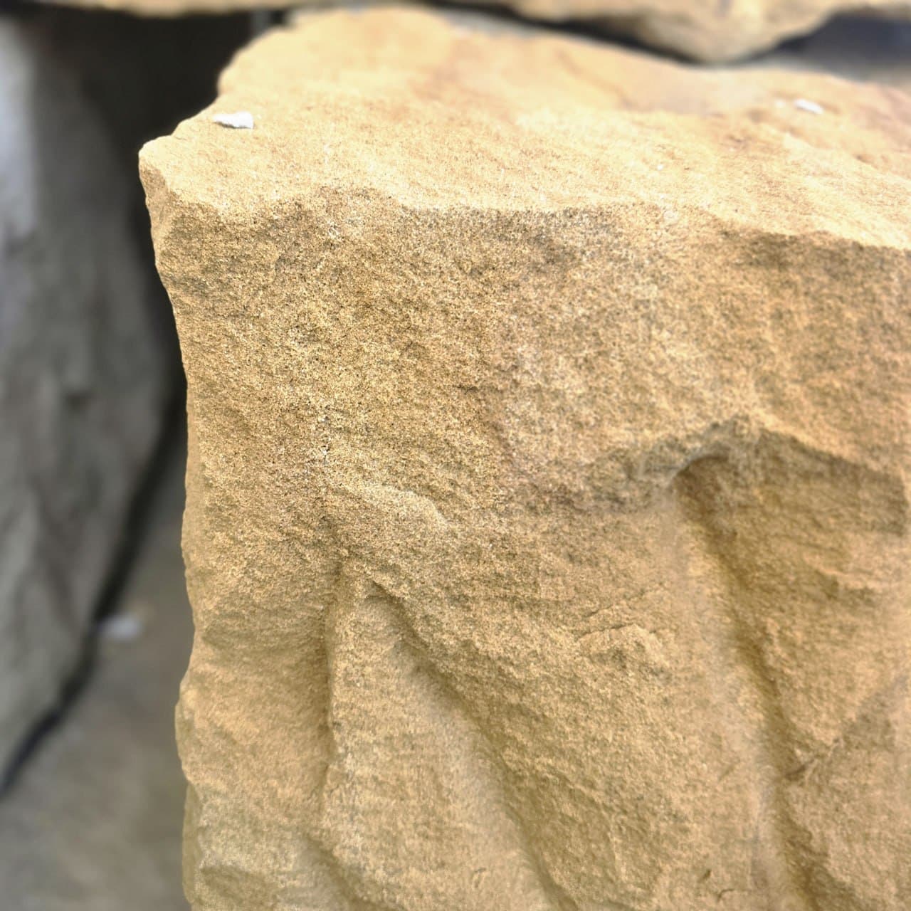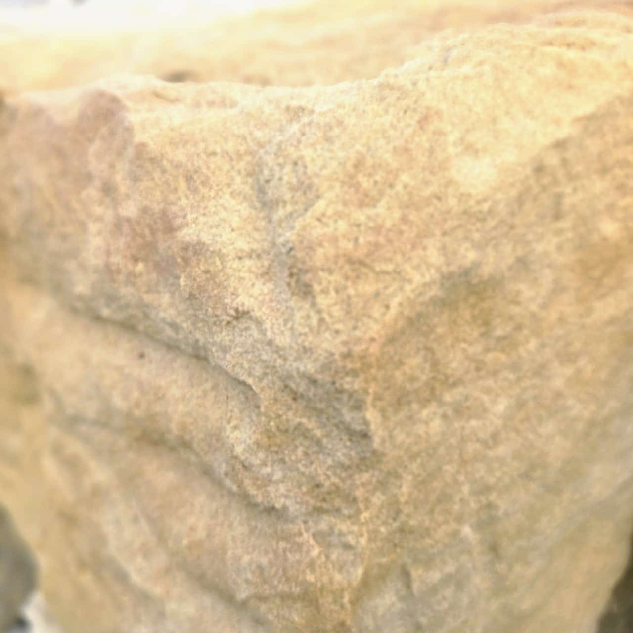 Die Oberfläche zeigt die typische Struktur des gelben Sandsteins: warme Beige- und Ockertöne, natürliche Schichtungen und feine mineralische Einschlüsse.